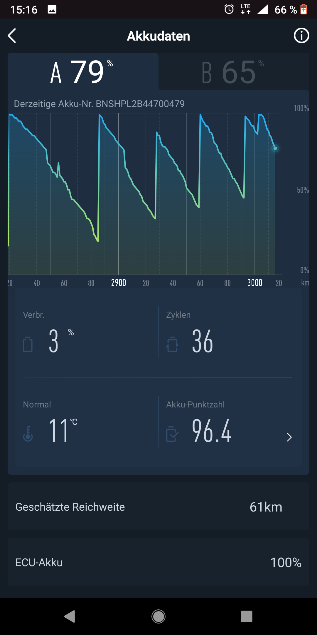 Ziemlich unvorteilhafte Werte zwischen den Ladeständen beider Akkus. 14%? Das würde bedeuten, du fährst im Zweifel nur mit einem Akku. Ist das so gewollt? Wann hast du beide Akkus gleichzeitig mal richtig voll geladen?