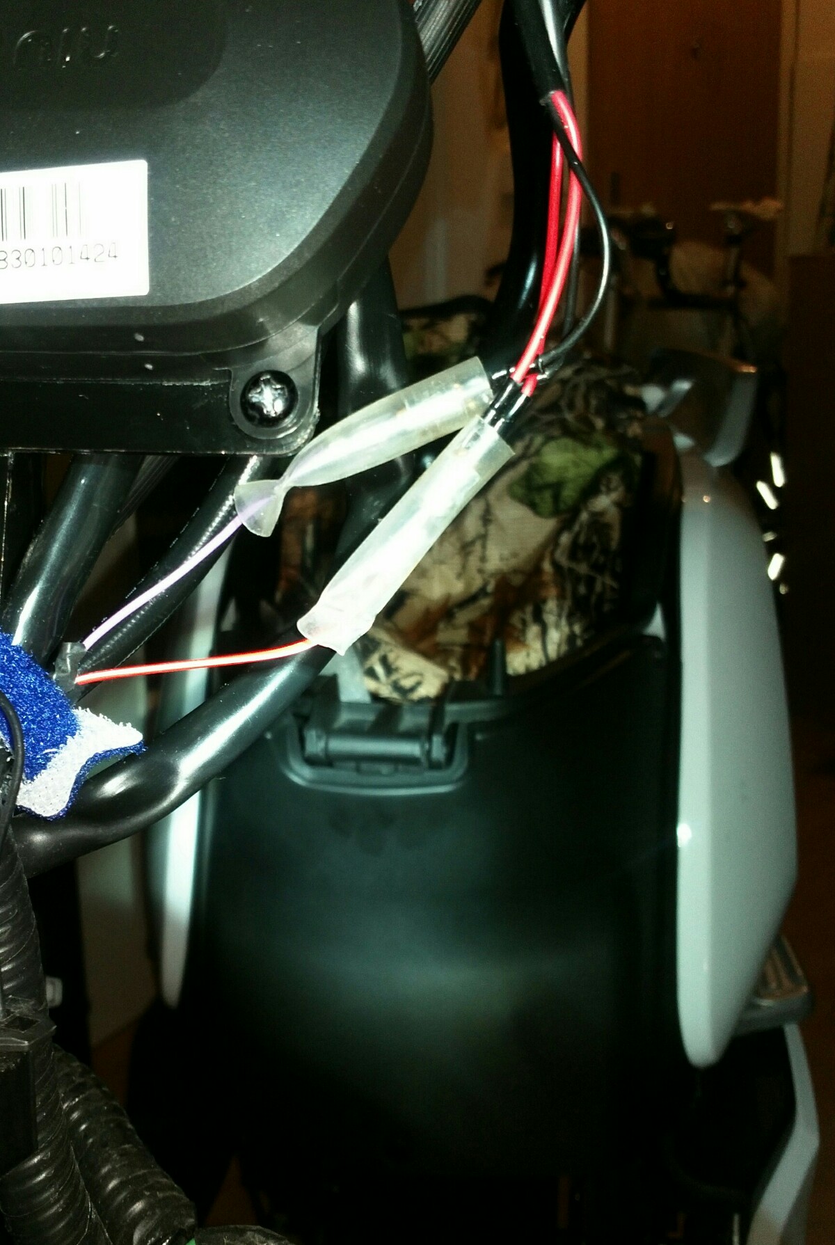 Also vom Bremsgriff unten innen (Bild eins), wo das Signal vom Hebel abgenommen wird gehen zwei Kabel nach unten - Höhe schwarzes Plastikkästchen vorn (Bild zwei)- zwei Steckverbinder - von dort weiter zum Motorsteuergerät.