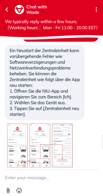 Hallo, hier ist Wade vom NIU-Kundensupport.Ich überprüfe die obigen Nachrichten und sehe, was ich für Sie tun kann. Bitte warten Sie einen Moment.Mit dem NIU Smart Service können Sie 17 verschiedene Moped-Status in Echtzeit auf Ihrem Smartphone überprüfen. Sie behalten den Standort, den Fahrverlauf, den Status und die Leistungsstatistik Ihres Mopeds im Auge. Außerdem erhalten Sie hilfreiche Erinnerungen bei ungewöhnlichen Bewegungen und Fernverriegelung. Läuft Ihr Smart Service ab? Kein Problem! Folgen Sie diesen einfachen Schritten, um ihn zu verlängern:
