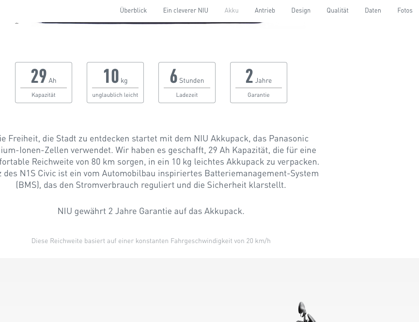 Wenn er genauso hochwertig ist wie er auf der Website dargestellt wird, dann ist er ein gutes Angebot. Wie aber so häufig, muss man sich auf der Hochglanz-Website wichtige Infos erst mühsam zusammensuchen. Beispielsweise ist an mehreren Stellen die Rede davon, dass der Akku eine Kapazität von 29 Ah habe. Ohne die Angabe einer Spannung ist diese Information aber nutzlos. Die Akku-Spannung wiederum findet man aber nur an einer einzigen Stelle, und zwar auf http://www.niu.com/de/n1s/specs. Sie soll 60 Volt betragen, woraus sich eine rechnerische Akku-Kapazität von 1,74 kWh ergibt. An diesem Wert kann man allerdings berechtigte Zweifel haben, denn er basiert auf der Ladeschlussspannung und nicht auf der Zell-Nennspannung (Erläuterung s. u.). Jedenfalls müsste an jeder der zahlreichen Stellen, an denen die 29 Ah genannt werden, stattdessen die Kapazität in kWh angegeben werden.