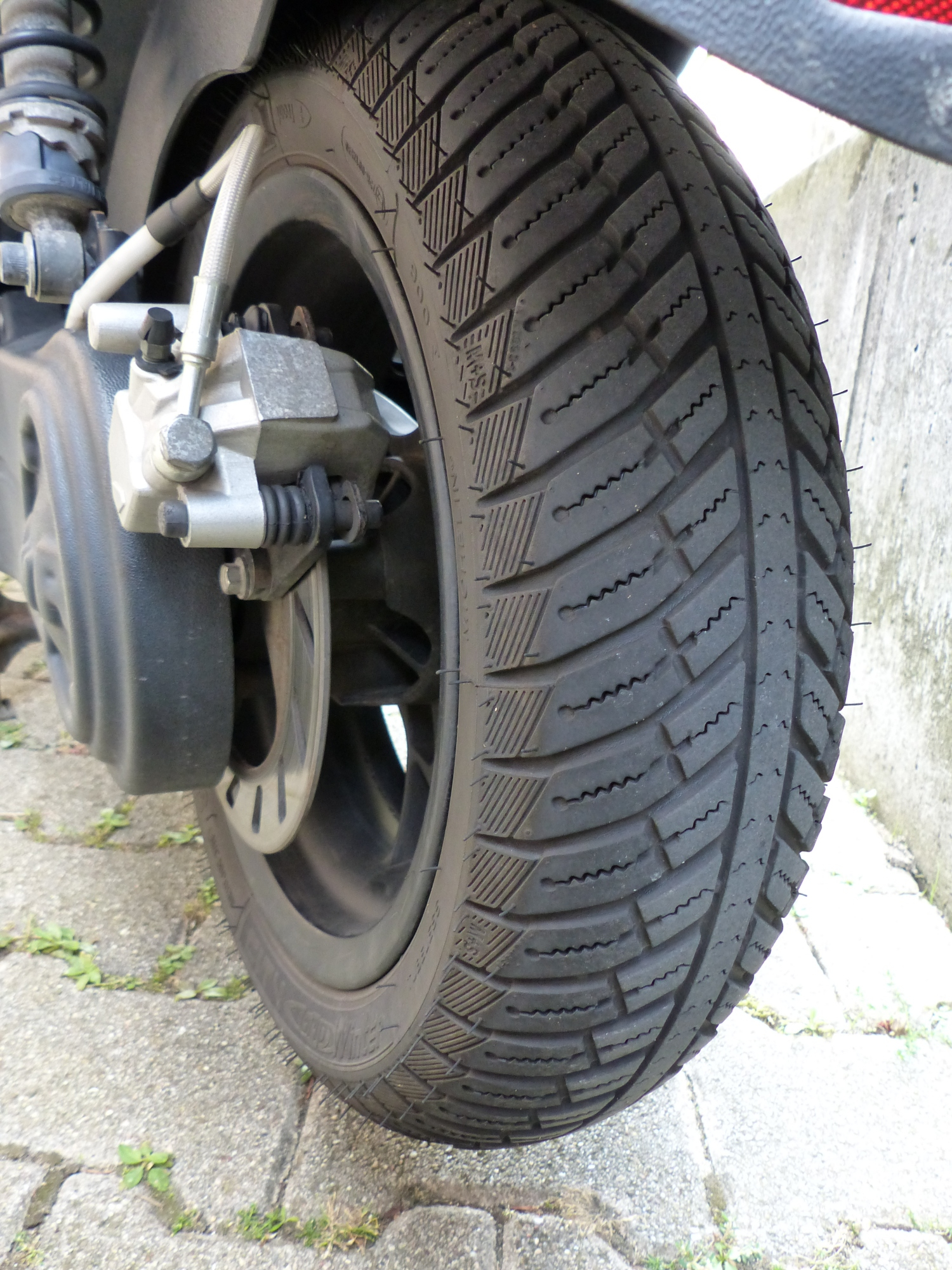 City Grip ist ein super Reifen! Explizite Vorderreifen können am Roller in umgedrehter Drehrichtung problemlos verwendet werden. So hatte ich das auch am vR ONE, mit der Winter-Ausführung vom city Grip. Vorne in korrekter Profilrichtung:
