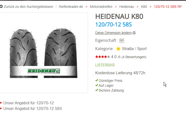 Danke, sind wohl für vorne und hinten montierbar, die HEIDENAU haben jetzt über 15.000 drauf. Und der 120 x 70 12 wird mit dem K 80 Profil wohl nicht mehr angeboten.
