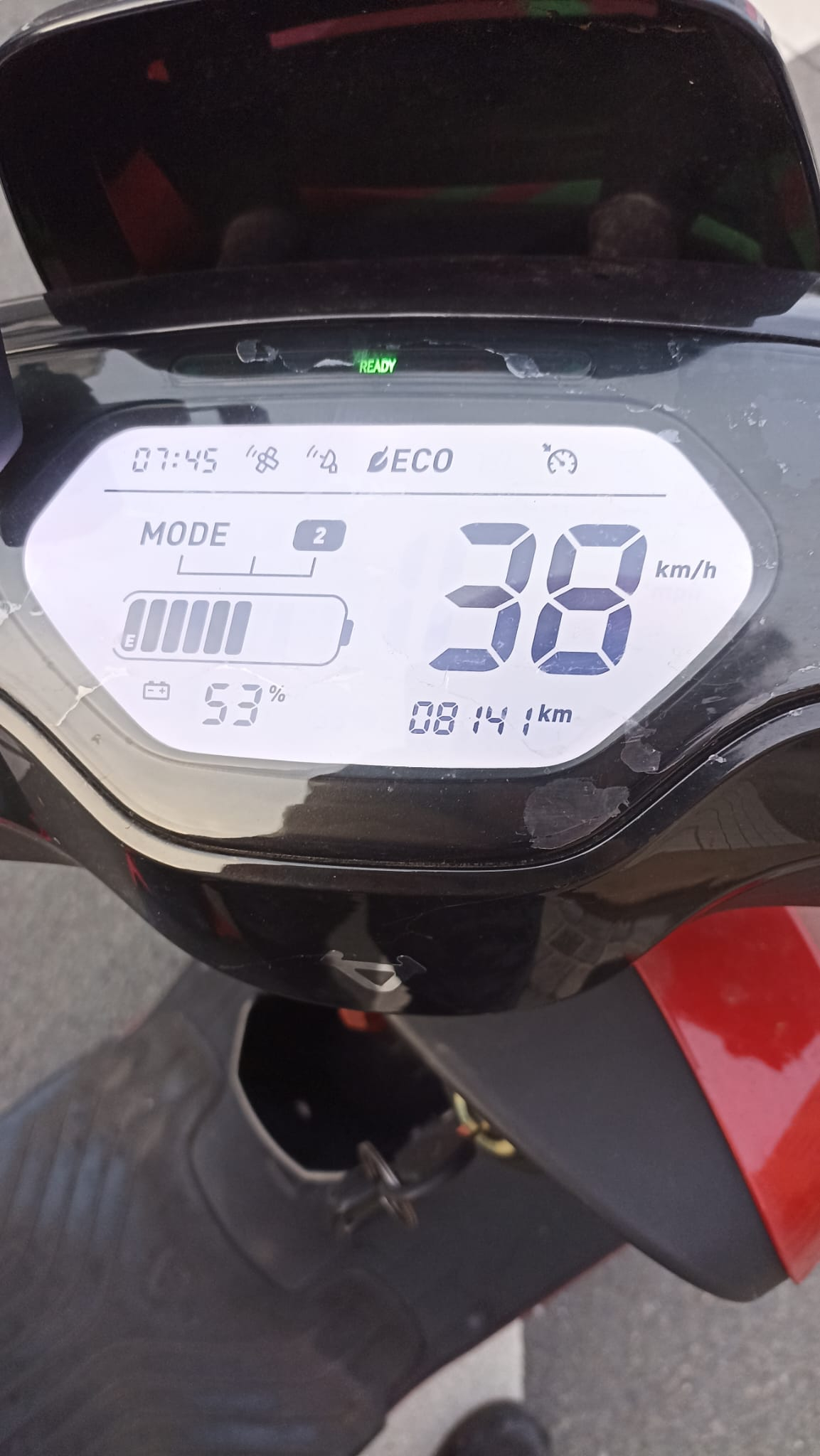 Der Roller bremste von selber sporadisch von 45 auf 40 km/h runter und rekuperierte dabei von selber. Dieses Problem konnte ich mit dem Abbau des Geschwindigkeitssenors am Vorderrad beseitigen. Der Roller fuhr danach hervorragend.