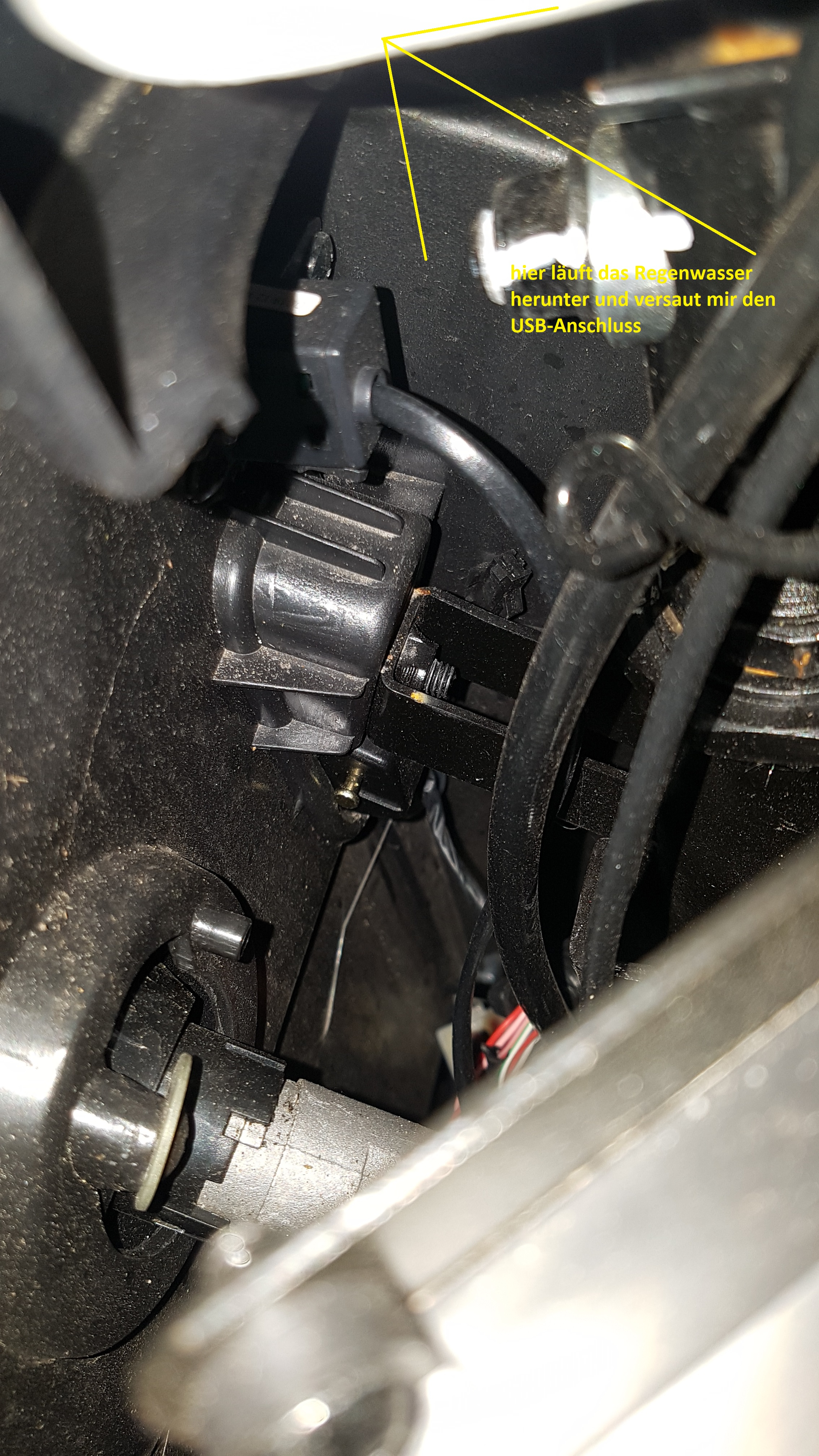 da oben an der Kante läuft das Regenwasser herunter und innen ander Verkleidung in den Fussraum. Solande der Roller steht kann ich ein Plastiksack rüberziehen ( würg ) . Aber während der Fahrt säuft es ab. Nicht bis zuende gedacht. Schade