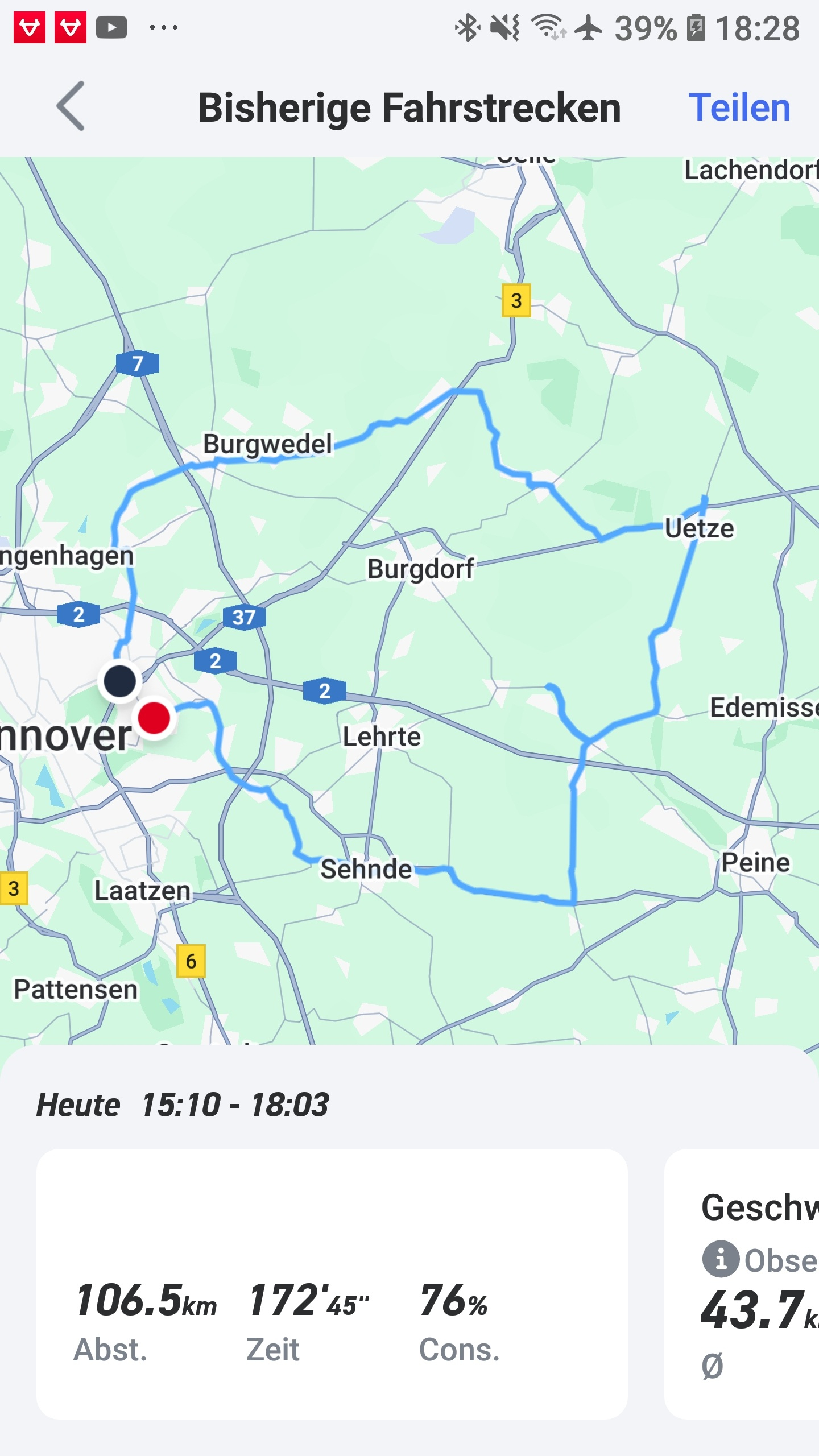 Aber er hat schon abgebaut. Als er neu war bin ich von Hannover an die Ockertalsperre gefahren. Dort aufgeladen und wieder zurück mit fast vollem Akku. Das schafft er heute nicht mehr.