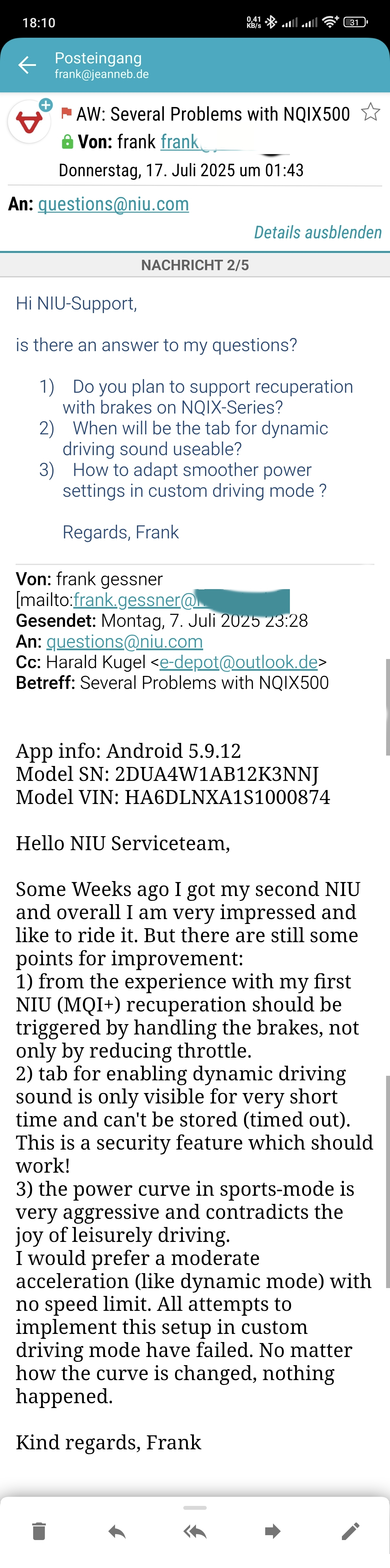 Ich habe versucht über die App den Support von NIU zu erreichen. Lange Beschreibung in Englisch, aber ist dato keine Reaktion 😕 IMG_20250812_181250.jpg