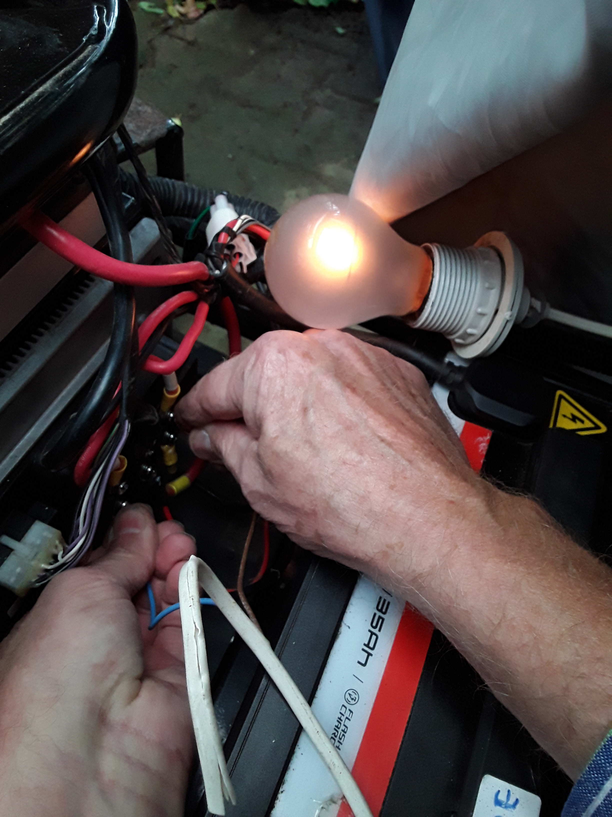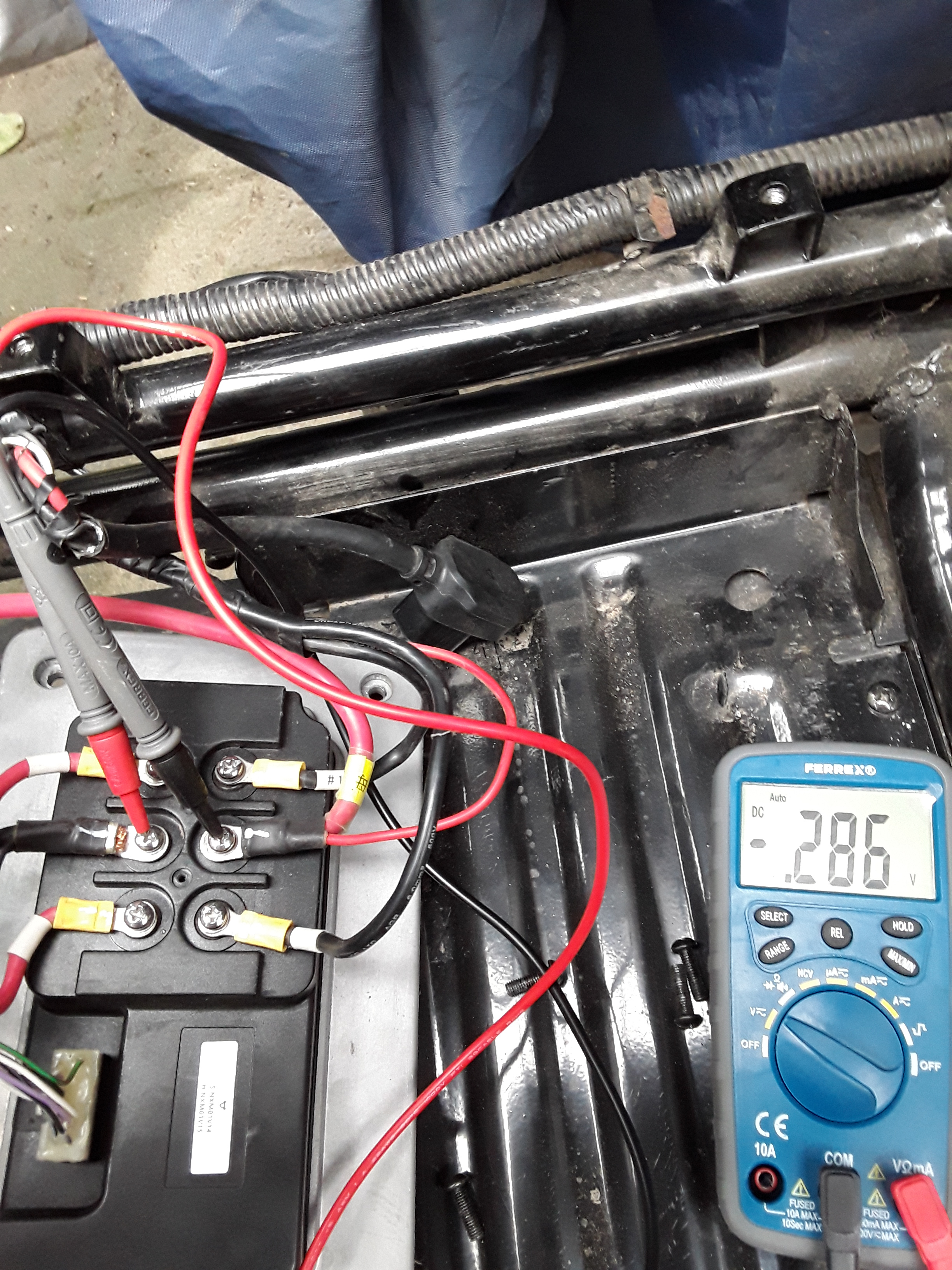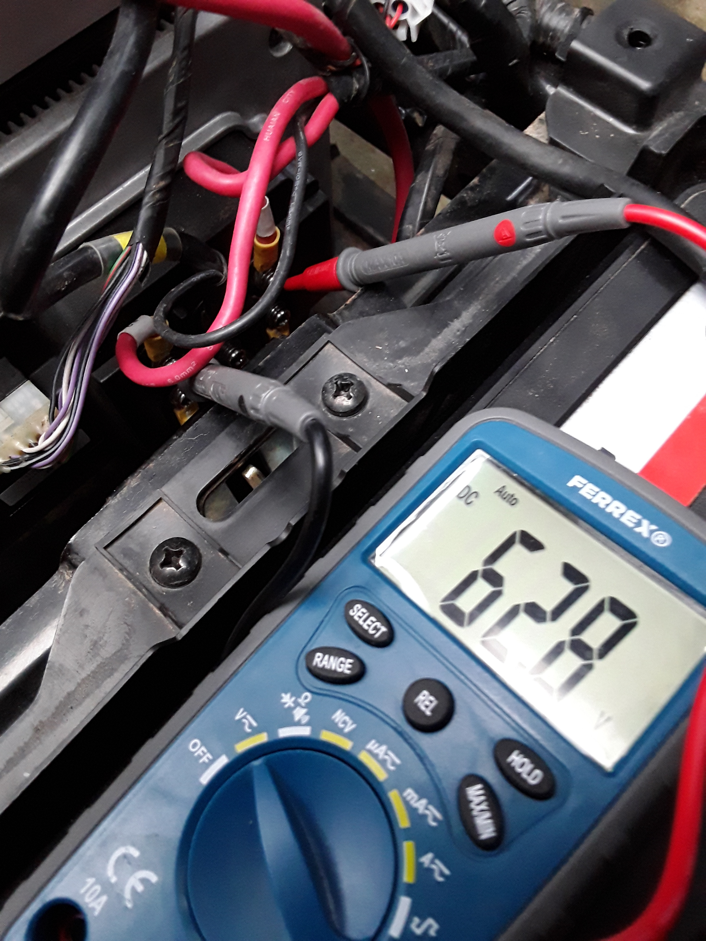 Jetzt würde ich am Controller nachmessen, das Teil unter dem Sitzfach, da geht ein recht fetter Stecker dran, evtl. noch ein kleinerer, und farbige dicke Kabel, einzeln verschraubt. Hier interessieren nur rot und schwarz, die anderen Farben sind für die "Motorphasen". Ebenso sollte auf dem Controller eine Streifensicherung sitzen, also eine fette Schmelzsicherung.