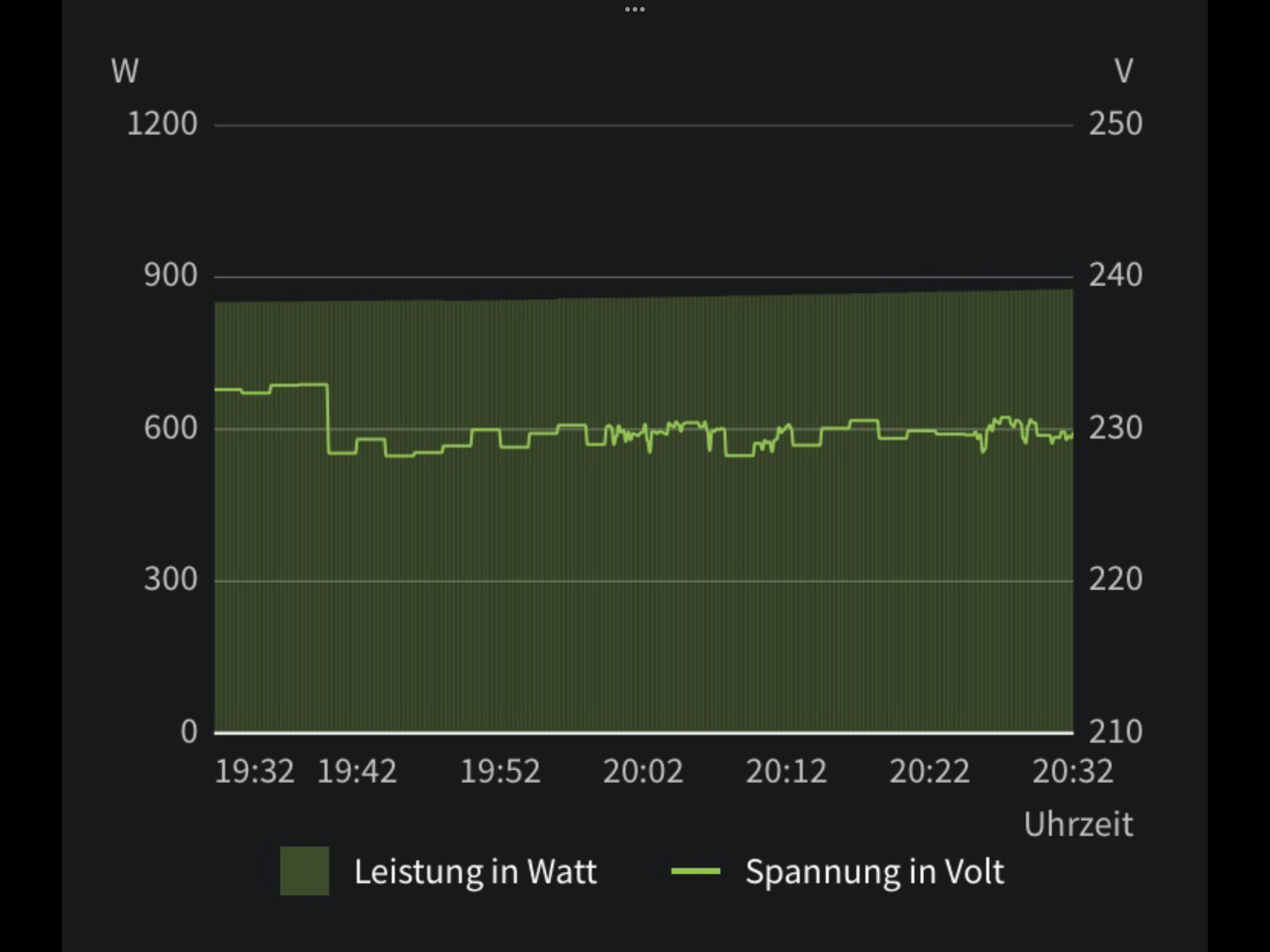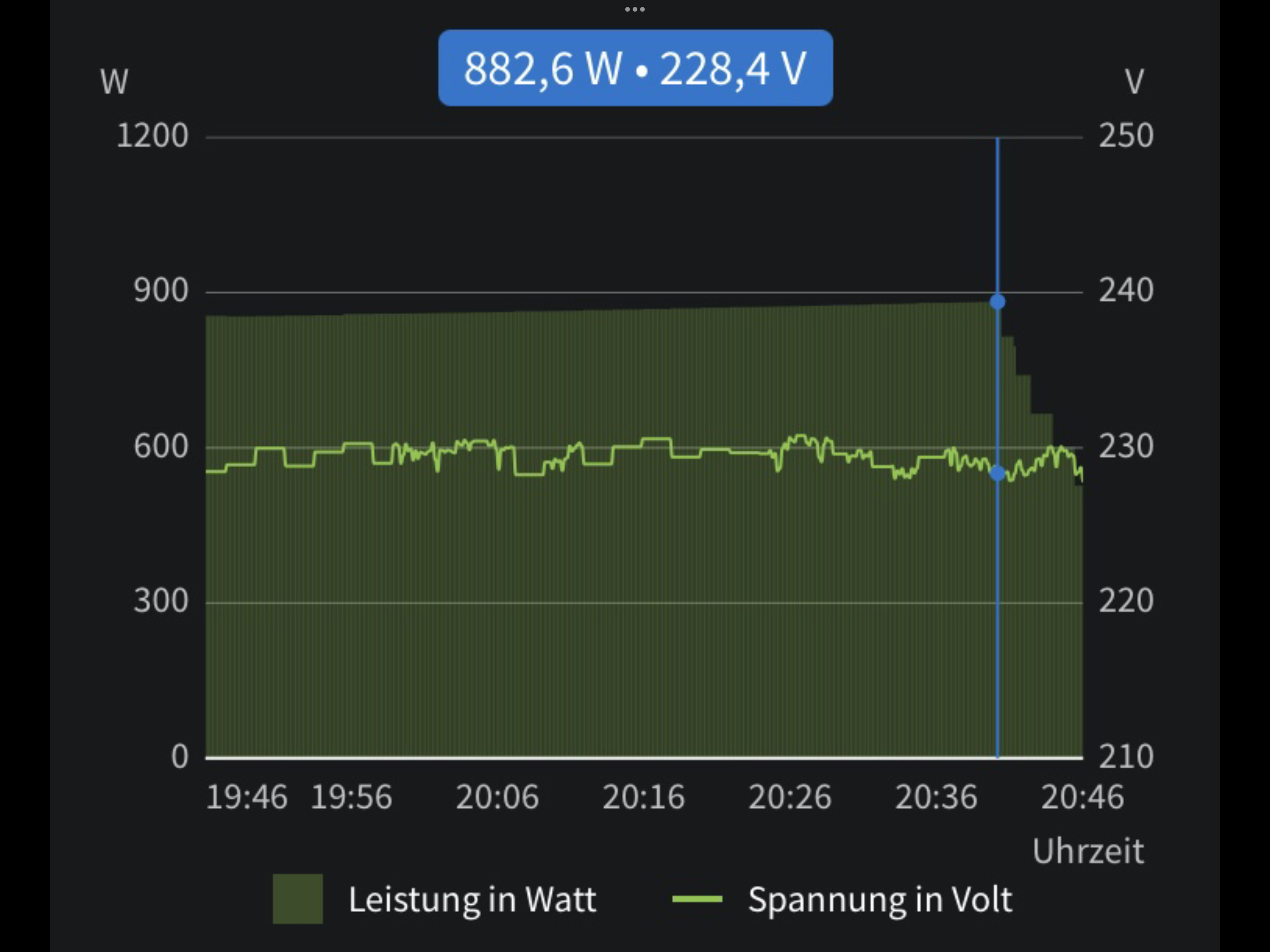 Ein Akku, von 20% auf 100%: in etwa um die 880W wird der Maximalwert erreicht und fällt dann stetig ab. Dauert dann ca. 35 Minuten und das Ladegerät schaltet mit der led auf gelb. Der Lüfter ist etwas laut, fürs Wohnung Laden geeignet in Räumen die nicht dem Schlafen dienen