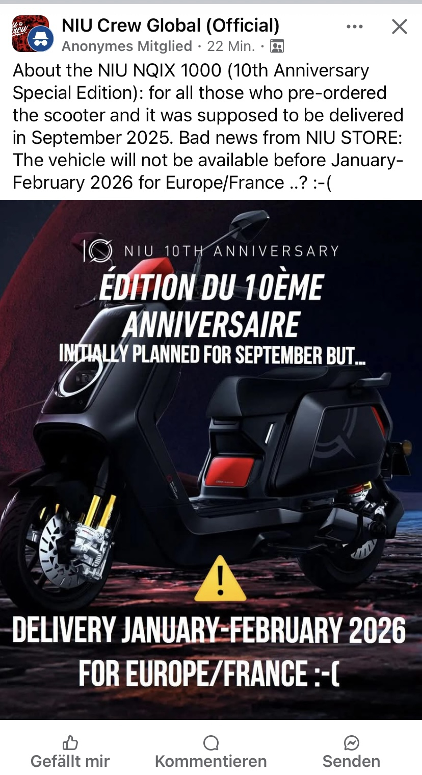 Ich habe gestern von NIU eine Email bekommen, das sich der Liefertermin von meinen NQX 1000 von September 25 auf das 1 Quertal in 2026 verschiebt. Als Grund sagen sie das bei finalen Tests auf einer Formel 1 Rennstrecke sie noch erkannt haben, das Sie das Fahrwerk noch besser machen können und das ABS natürlich gleich mit. Aber damit kann ich leben, lieber ein halbes Jahr länger warten und dafür ein sauber abgestimmtes Fahrwerk (Stoßdämpfer) und ein ABS das dann auch das richtig macht was es soll bekomme. Und sie haben auf der Rennstrecke auch einen Rekord gebrochen und sind mit dem NQX 100 jetzt das schnellste elektrische Motorrad ( Schreiben sie wirklich) das dort seither gefahren ist mit einer Rundenzeit von 2:58.958