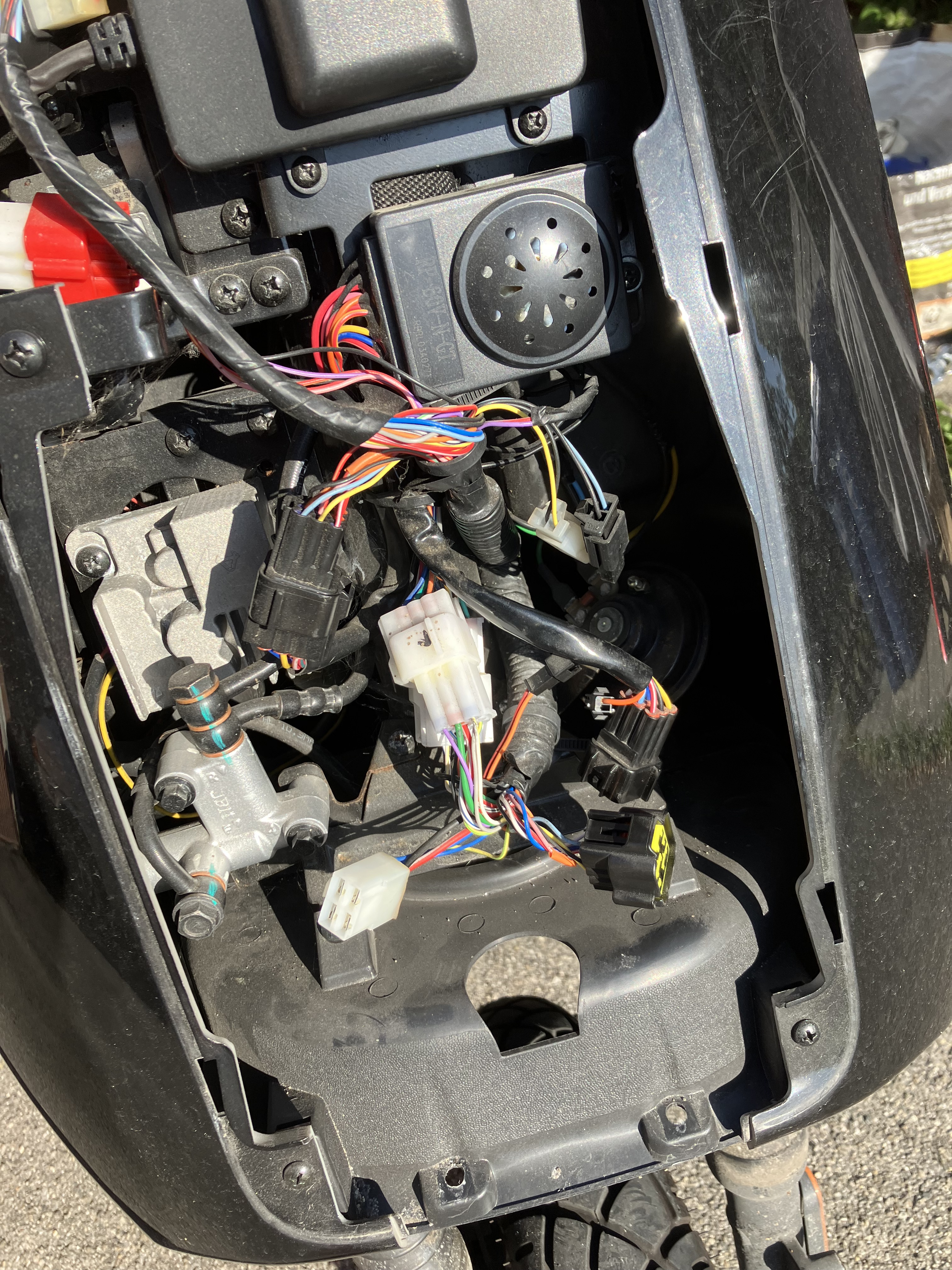 Beide Akkus raus, das Displayschild, die waagerechte Abdeckung oben am Lenker (Schrauben werden vorn oben durch Gumminoppen geschützt), das vordere Schutzblech und schließlich hebt man die vordere Abdeckung inkl.Lampe heraus. Letztere wird mit 2 Kreuzschrauben oben und 2 Kunststoffsteckschrauben unten über dem Vorderrad mit merkwürdiger Verankerungstechnik gehalten. Die waren das Schlimmste die raus zu bekommen…
