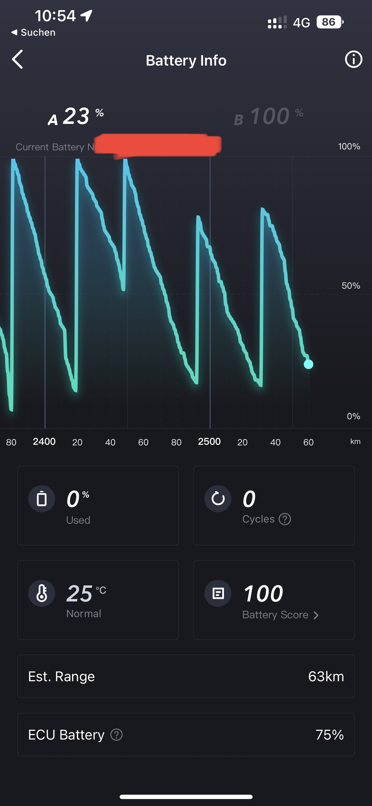 Die Anzeige des ECU Ladestandes scheint sich bei entnommenen Hauptbatterien nun endlich auch zu bewegen. Vorher verharrte die immer bei 100% bis irgendwann die Kommunikation einfach nicht mehr vorhanden war. Jetzt nimmt Sie je nach Standort, Funkverbindung und Außentemperatur um ca 15% je 8 Stunden ab. Also in 24 Stunden kann man sagen 45%. Würde also nicht besser oder schlechter sein als bei den vorherigen Modellen. Nicht verwunderlich wenn man sich vor Augen führt das es sich ja um die selbe 18650er Zelle im Steuergerät handelt. Wie sich nun die 12V Batterie verhalten wird bleibt interessant. Mit altem Update waren nicht mehr als 4 Tage Standzeit ohne Hauptakkus drin.