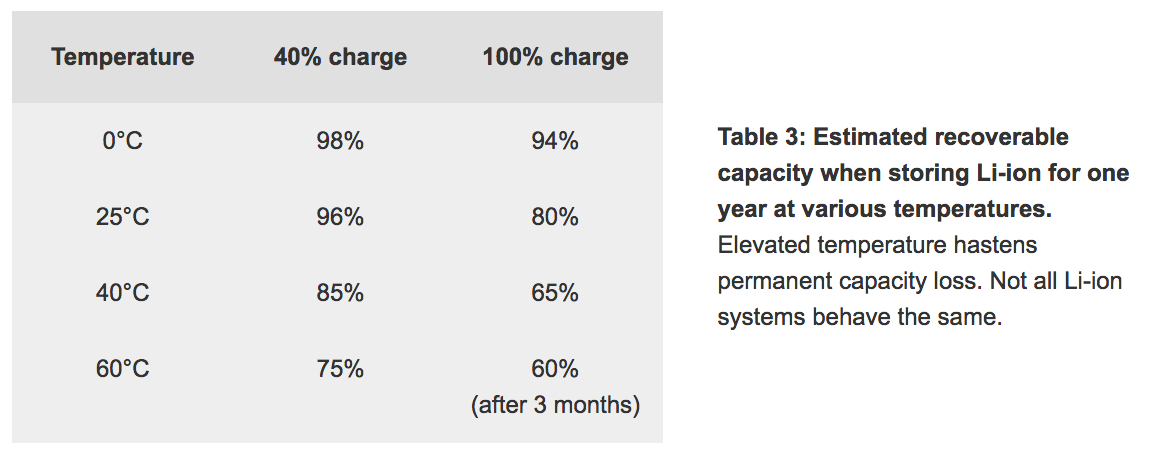 Dort ist auch der Zusammenhang zwischen Temperatur bei Lagerung und dem zu erwartenden Kapazitätsverlust dargestellt.