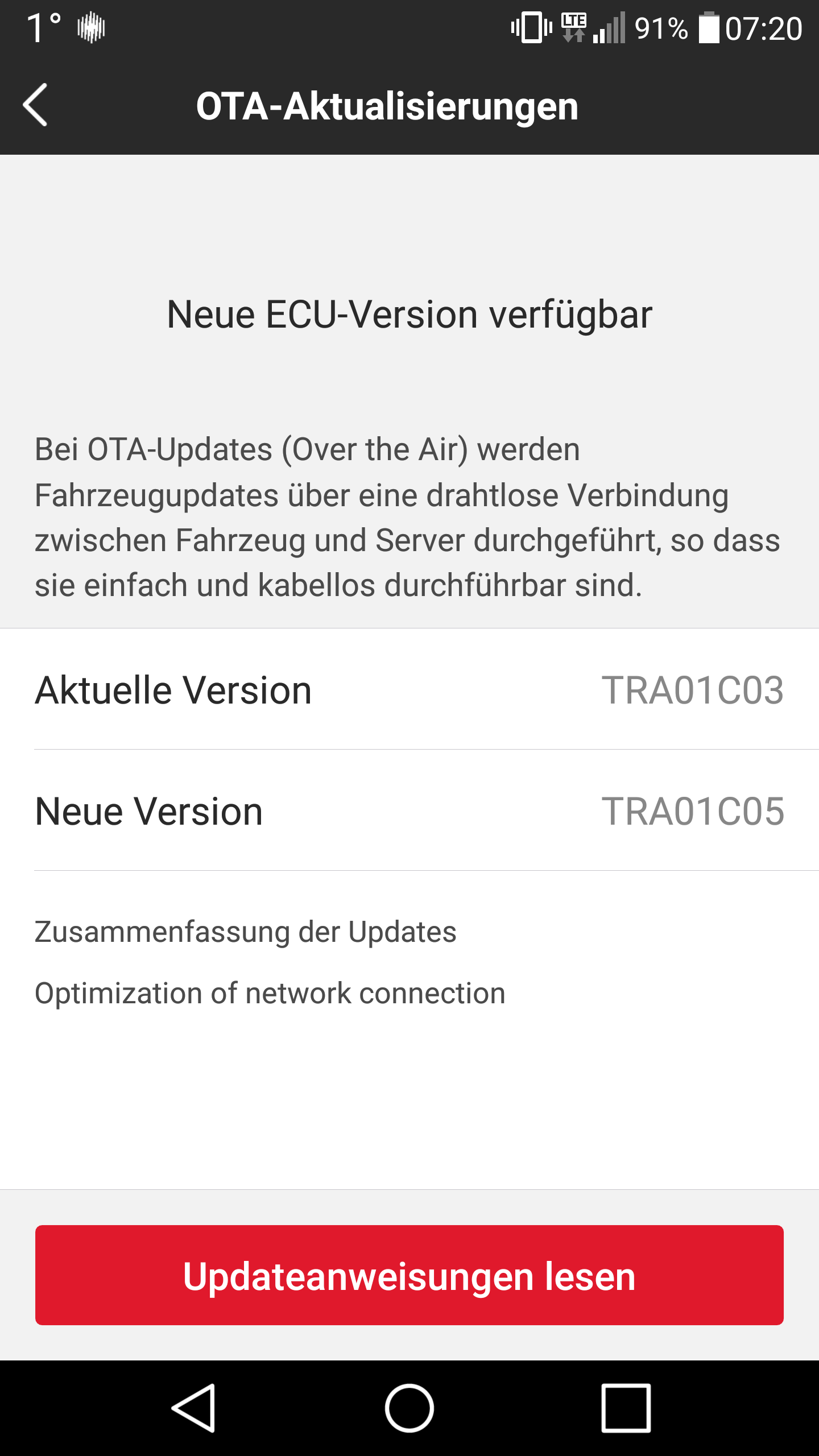 Inzwischen wird in der App das Softwareupdate angboten, welches dann dafür sorgen soll, dass in der App wieder zuverlässig Daten angezeigt werden (mit der V14 sowie der aktuellen Version für die 2018er ist das nicht der Fall).