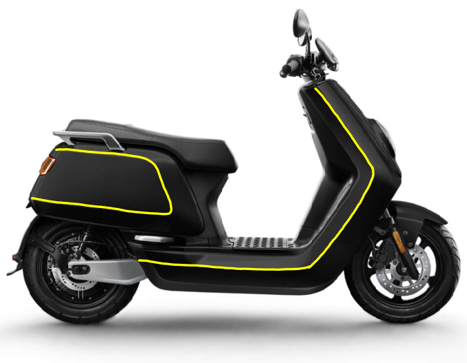 Um nur die Konturen des recht eckig gehaltenen NIU sicherheitstechnisch hervorzuheben, würde ich Hochreflexband in der gewünschten Farbe verwenden. Das ist bezahlbar und man kann es selber verarbeiten (vielleicht vorher mal woanders testen). Bezugsquelle z. B. hier (externer Link). Ein Reflexband mit 25mm Breite sollte für den kleinen NIU ausreichen.