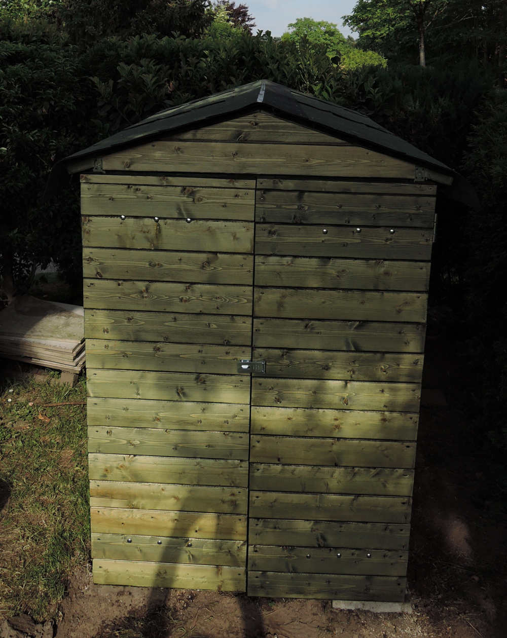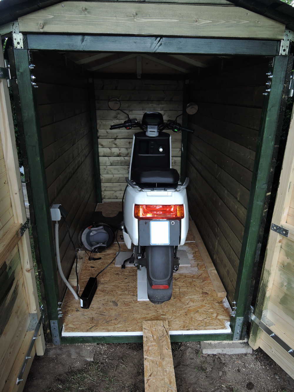 Dieser Fred ist für Beiträge gedacht, die sich mit allen Maßnahmen beschäftigen, welche zum möglichst langen und technisch möglichst guten Leben eines Niu-Rollers führen sollen. Fange an mit der Vorstellung der Unterbringung meines neuen N1S. Die Hausgarage war viel zu klein, im Gartenhaus wurde er nur küzestfristig toleriert, also musste ein eigener Unterstand her. Wohlan, denn.... eine eigene Garage für den Niu! "Nur" aus Holz, aber lass' ma..! Hat mich über 1 1/2 Wochen beschäftigt. War kein Bausatz, sondern selbst konstruiert. Eher teurer, dafür aber tornado-sicher.