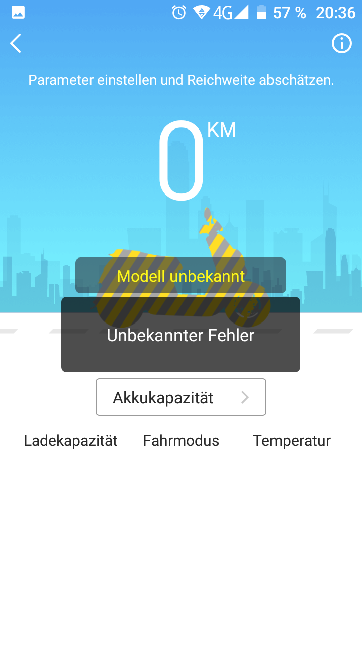 Ich habe die iOS Version 3.4.4 mit der Firmware ECUKSR1.3 und bei mir läuft es. Es wird der NIU in der richtigen Farbe annimiert rollend vor Hintergrung dargestellt. Zur Auswahl gibt es zwei Akkus (20Ah und 34Ah). Einstellen kann man Ladekapazität (50/70/90 kg) Fahrmodus (1/2/3) und Temperatur (0/10/25°C). Daraus errechnet dieser Teil der App eine Kilometerabschätzung.