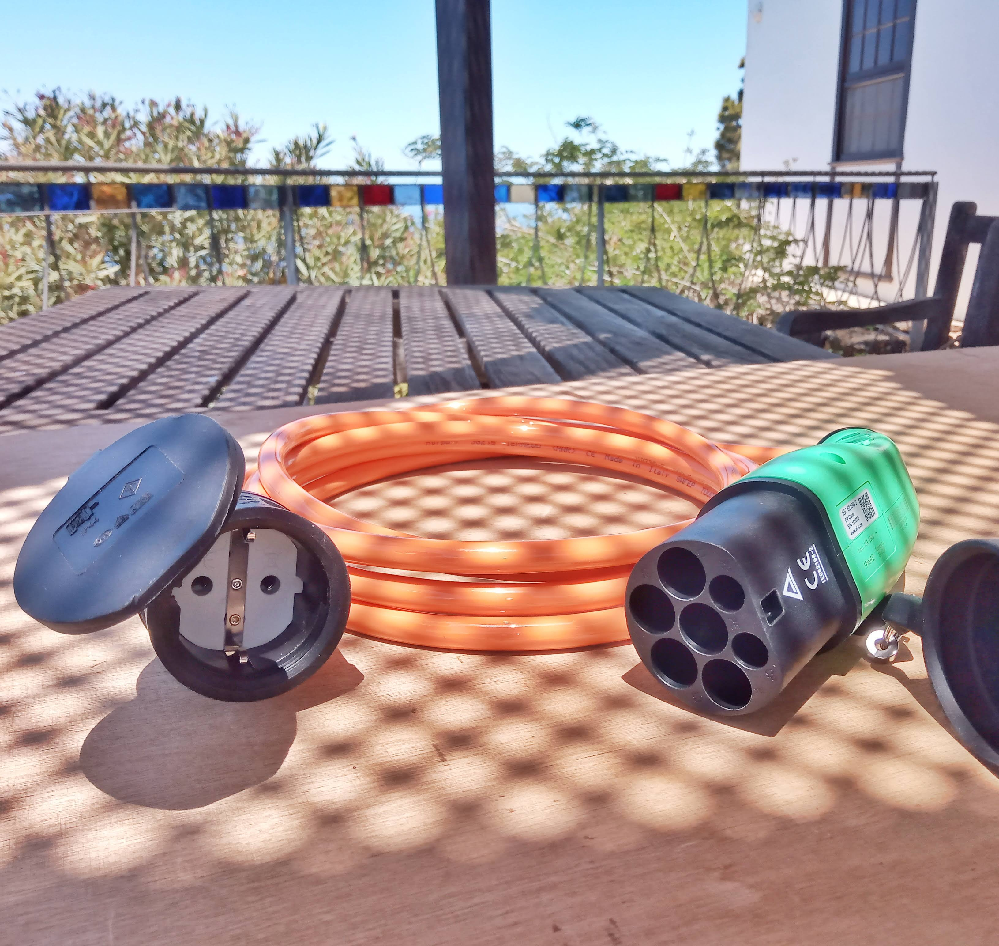 Wir haben für unsere Schnelladegeräte ein Typ-2-Ladekabel mit Schuko-Dose zum Laden an öffentlichen Typ-2-Dosen von Evalbo. Als Kabellänge haben wir 3 Meter genommen, das ist ein guter Kompromiss: noch leicht und kompakt und man kommt an alle Ladesäulen ohne komplizierte Parkmanöver heran. Weniger als 3m wäre aber zu knapp.