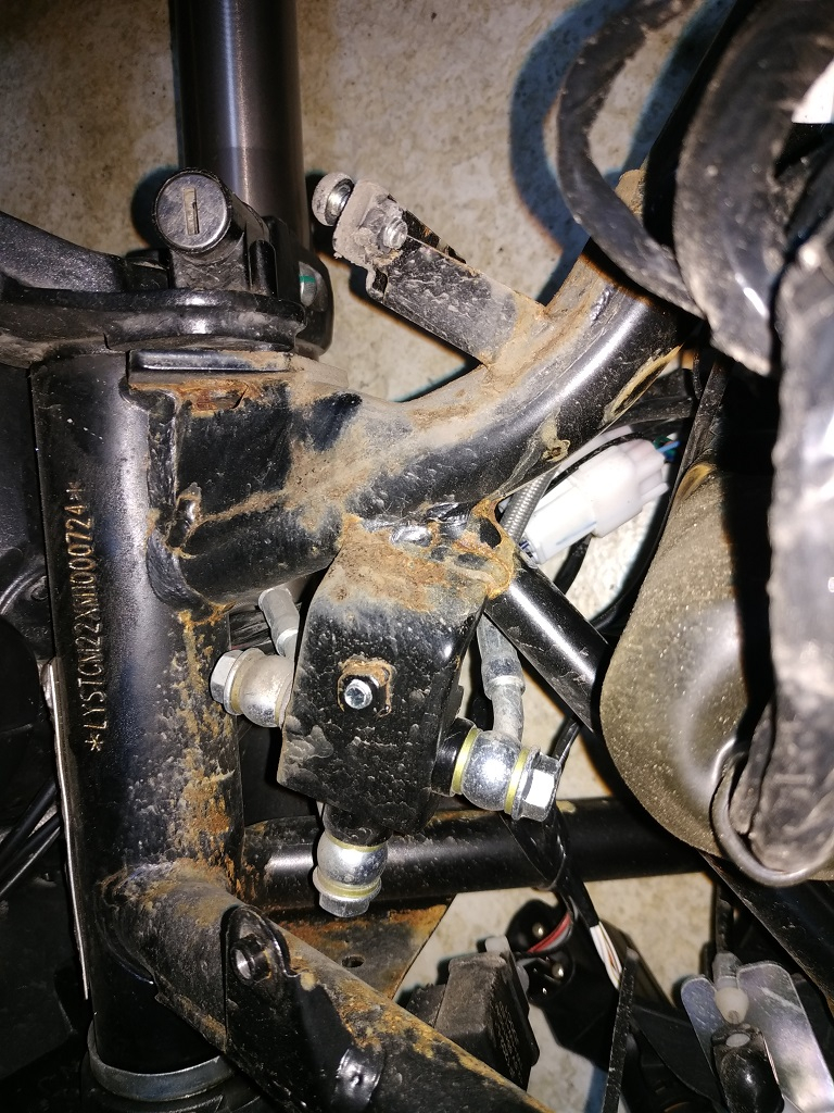 Ich weiß nur, dass ich mittlerweile die dritte Bremszange vorne verbaut habe. Die Telegabel hatte Rost angesetzt und die Dichtungen wurden undicht. Die Radlager waren im Zeitraffer verrottet. Die Speichennippel sind rostbraun. Und der Rahmen sah nach einem Jahr Benutzung so aus (gekauft Sept. 2021, Bilder sind vom Sept. 2022):