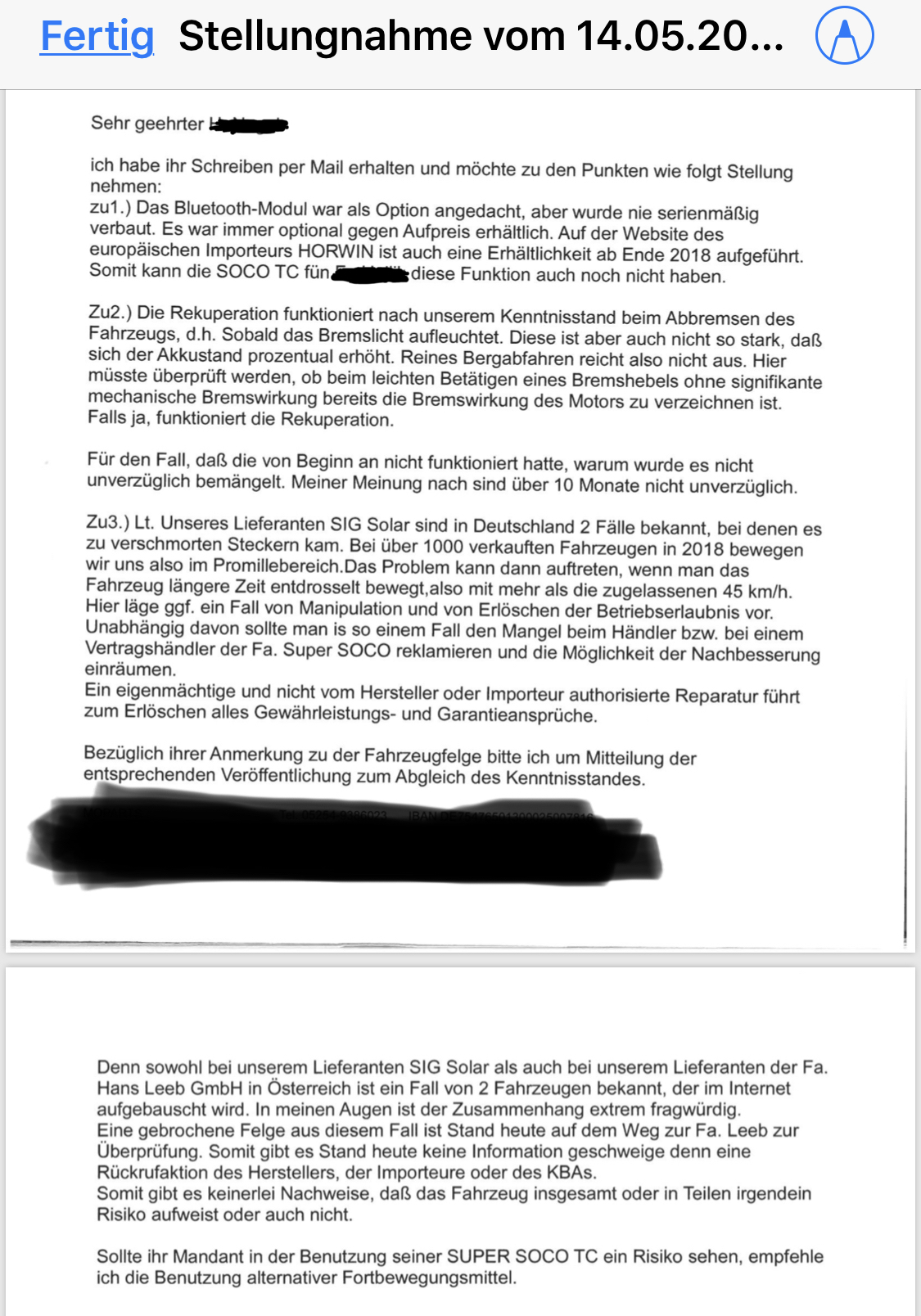 Wie ich es verstanden habe, wollte eigentlich die Firma an der Image-Pflege bzw. -Verbesserung dieses Jahr arbeiten. Eine Nachrüstung und Verbesserung an der Soco TC würde das mit Sicherheit tun, da die Katze jetzt endgültig aus dem Sack ist und eine Klage kurz bevor steht.