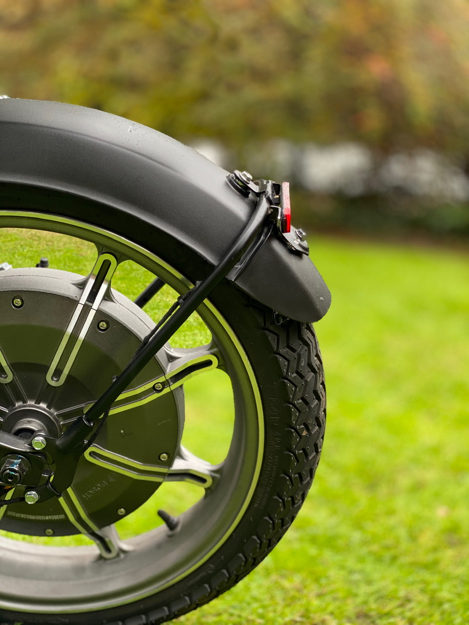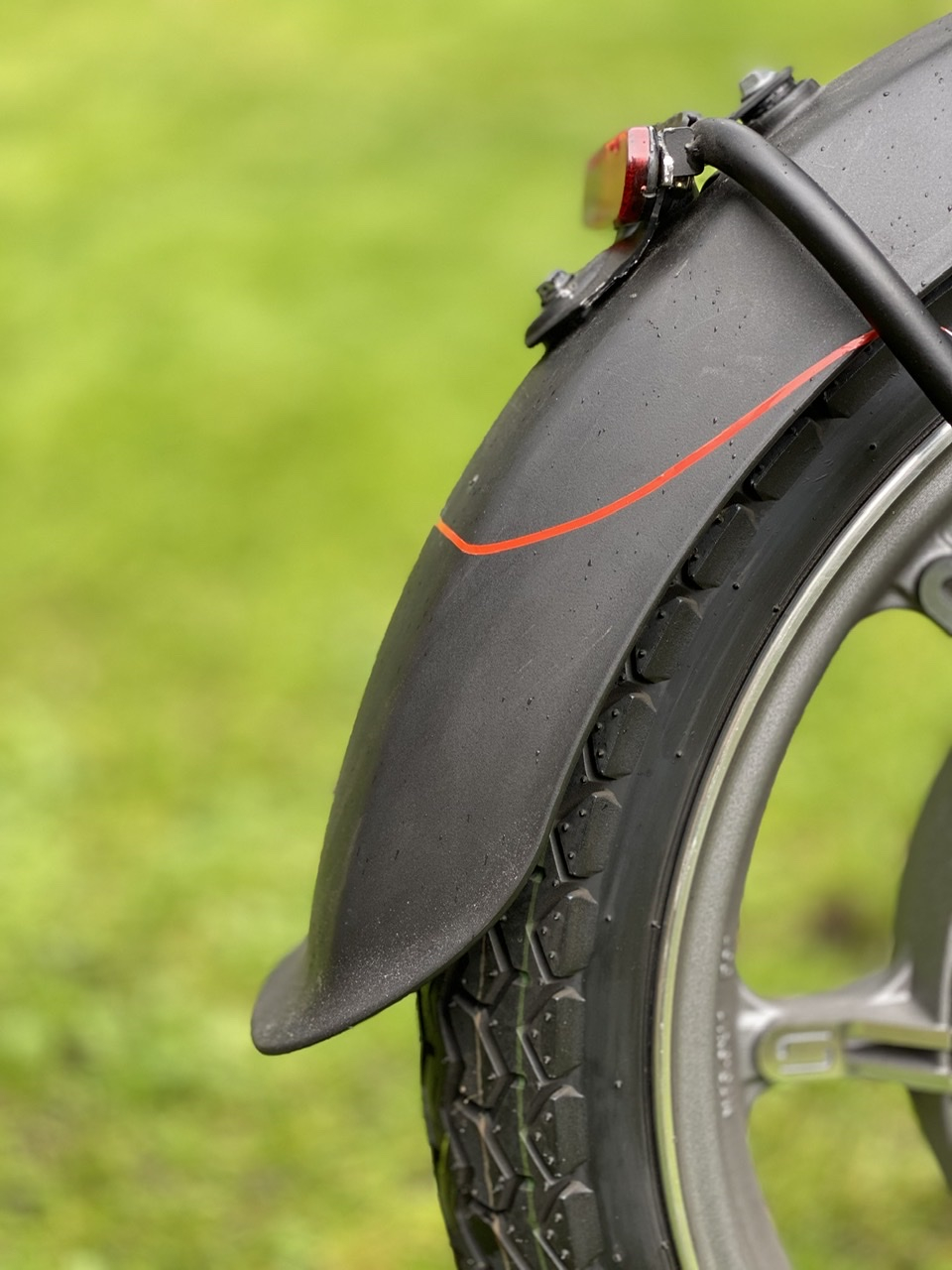 Heute musste noch das lange Oma-Schutzblech dran glauben. Strahler ist nach unter gewandert und das Kennzeichen nach oben :