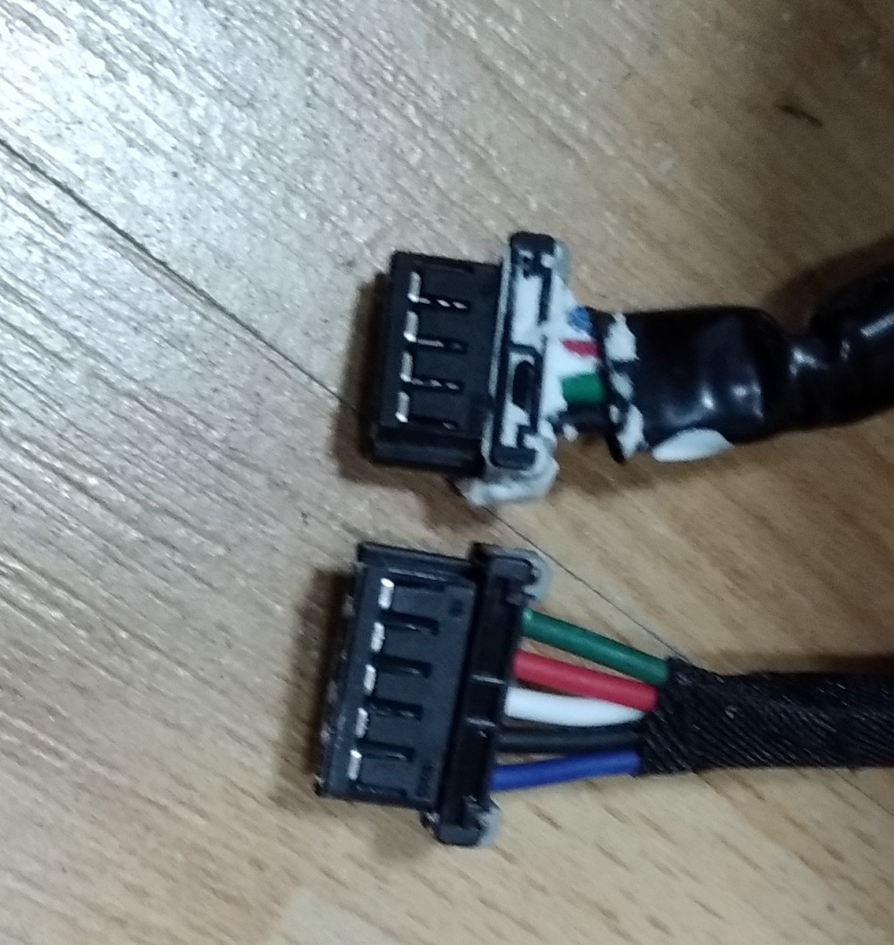 Leider nicht so ganz passend: Oben das ausgebaute Kabel, unten das von "SuperBike Tech Store" gelieferte für die TCmax. Plus ist zu kurz, Minus zu lang und als Bonbon passt der Datenstecker auch nicht (auch hier oben ausgebaut, unten neu):