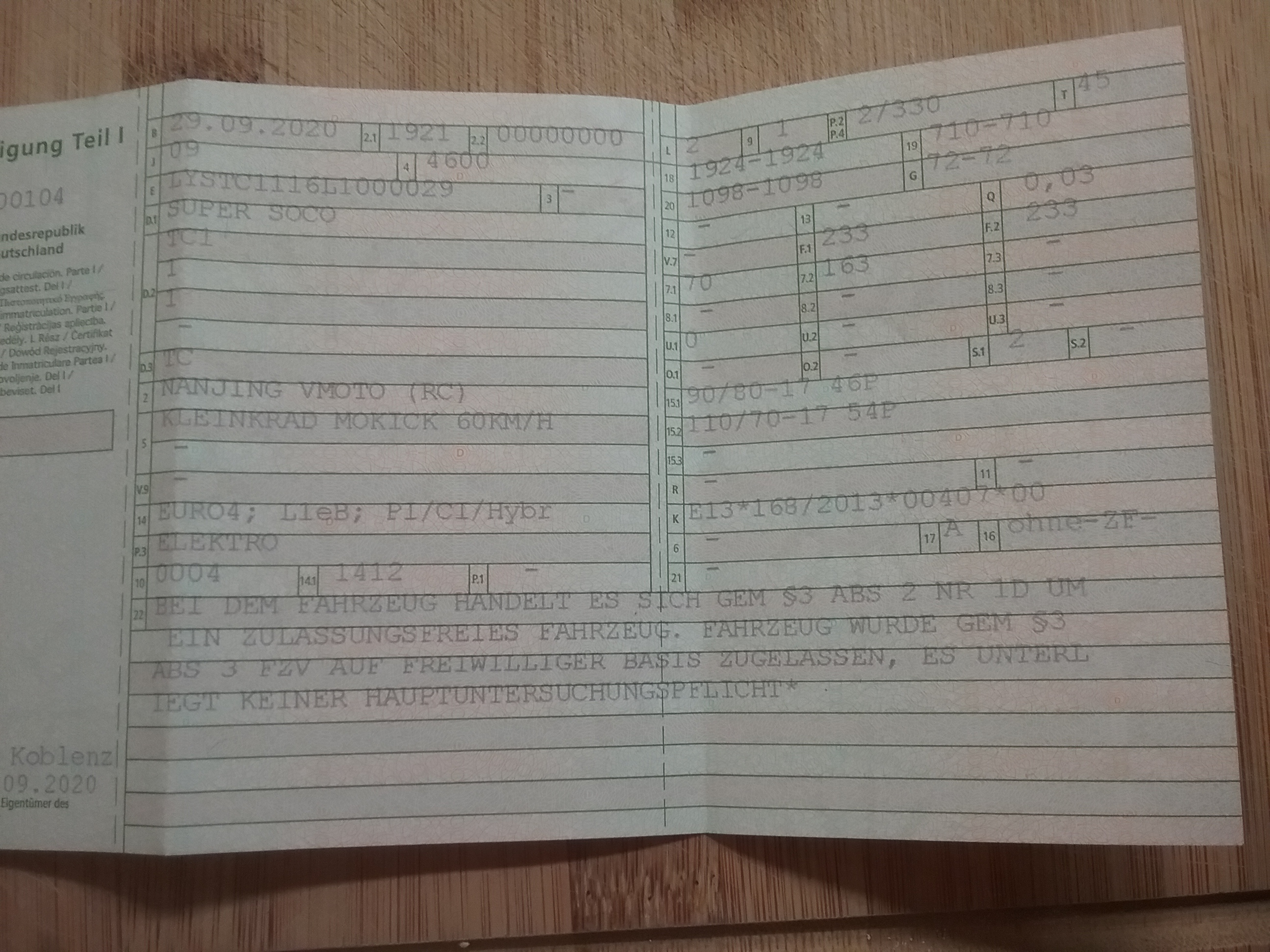 Wie gesagt...momentan ist sie als 60kmh Super Soco zugelassen.