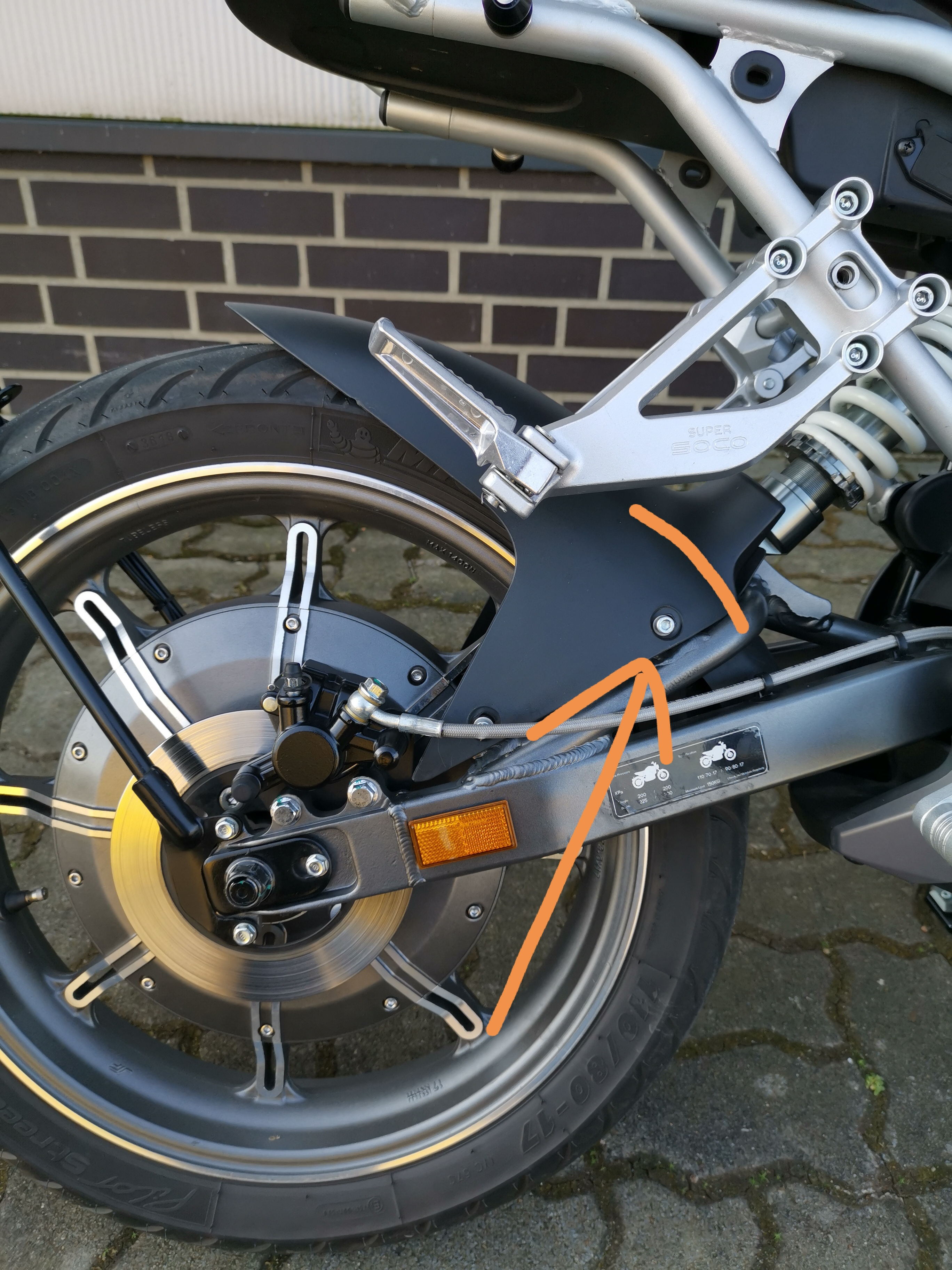 Der Reifen schleift hinten an der Schwinge / Dämpfer Aufnahme. Ich habs so gelöst, das ich an der Hinterrad Achse die Verderh Sicherungsbleche so weit ausgefeilt hab bis es passt. Also Langlöcher aus den Bohrungen gemacht. So lässt sich das Rad weiter nach hinten ziehen.