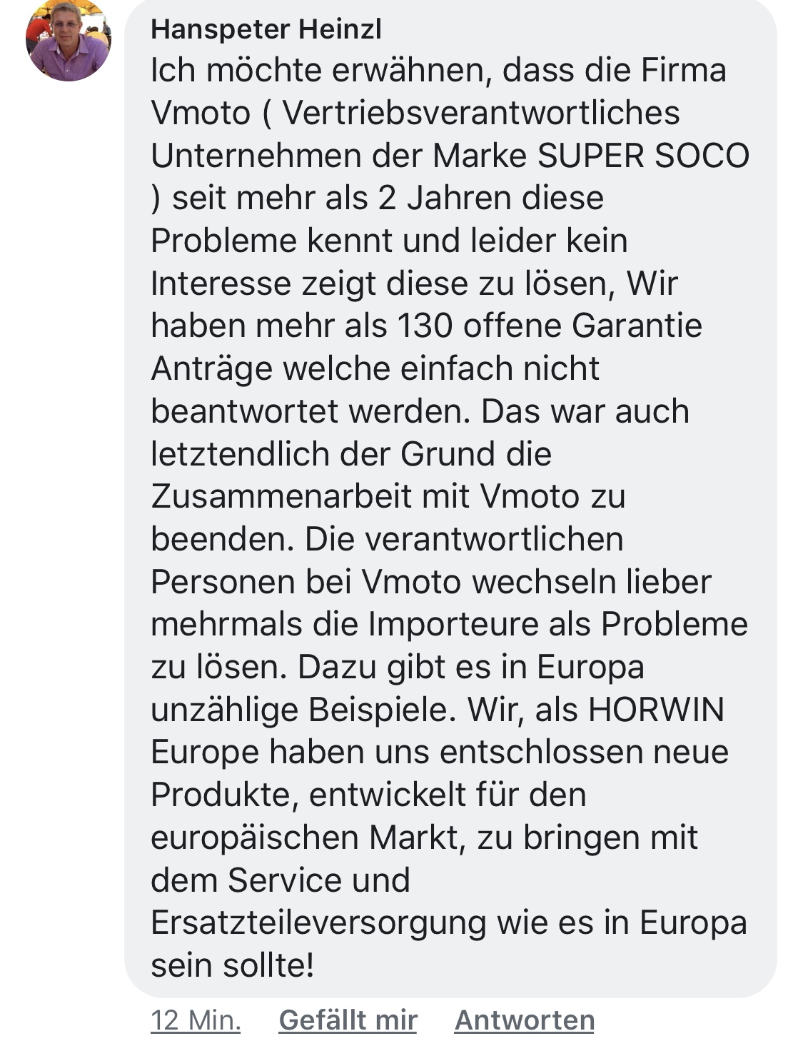 Hier eine etwas genauere Statistik, seit einigen Stunden in einer der Soco-Gruppen bei fb zu finden.Soconaut hat geschrieben: ↑Mi 24. Jul 2019, 14:20Auch das, tut mir leid, ist wilde Spekulation. Ich habe zB die Geschichte (hier und anderswo) genau andersrum gelesen: nicht Ausstieg des Importeurs wegen Mängeln am Gerät, sondern Ausstieg des Herstellers wegen (Service-)Mängeln beim Importeur. Und du bist doch selber derjenige, der sagt "Horwin war unterirdisch, Leeb hat mir den Spaß am Bike zurückgegeben". Aber auch diese Version der Story ist, na?! Spekulation! Tratsch macht Spaß, nützt aber nix!![]()