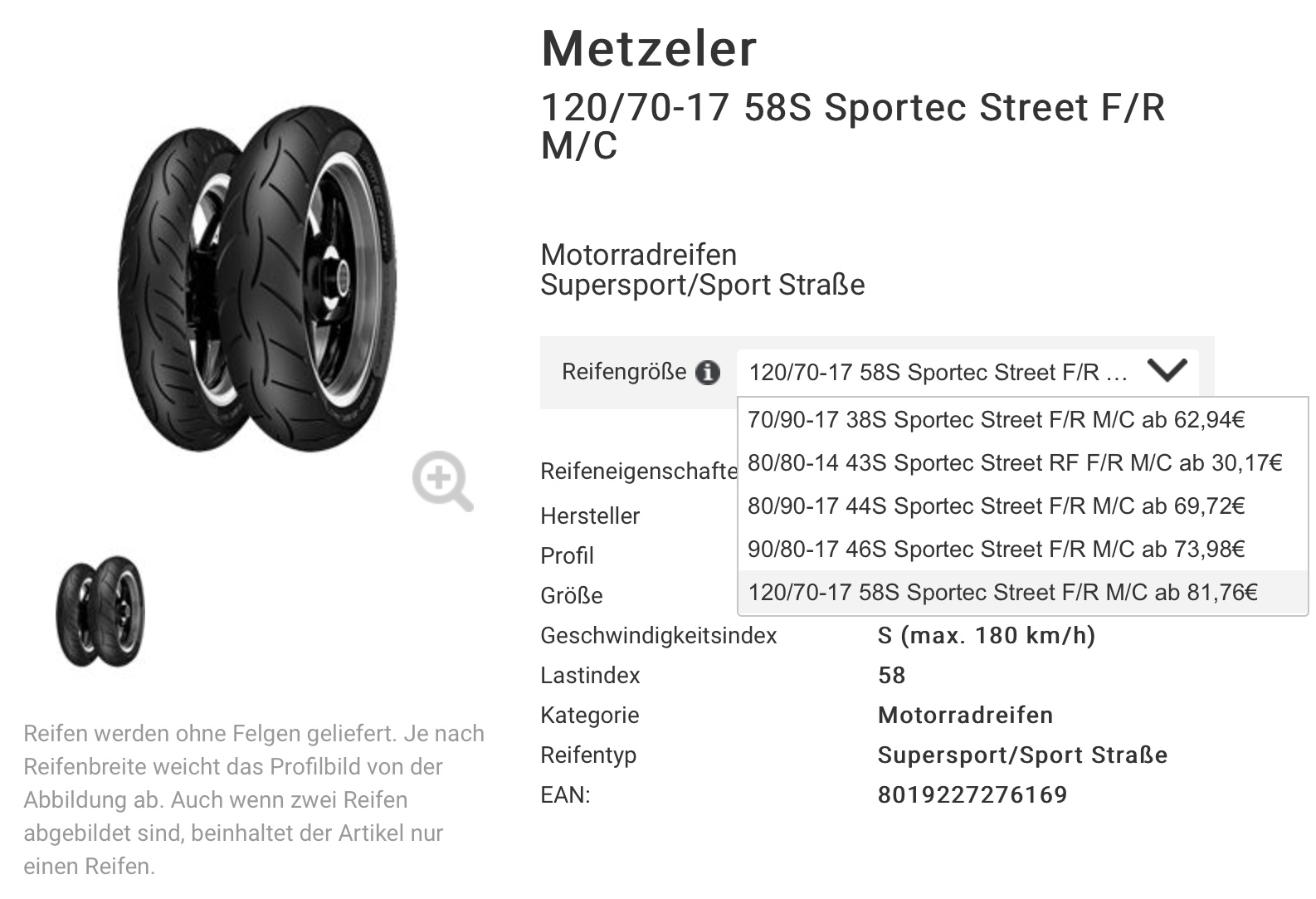 Mein Wunschreifen von Metzeler in der Größe 100/80-17 für vorne ist momentan nicht verfügbar.