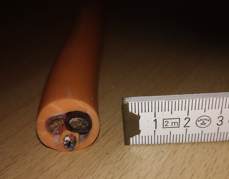Die Gesamtlänge des Kabels sind 32cm, gemessen von Steckeraußenkante bis zum glatt abgeschnittenen Kabelende (!!) und damit m.E. deutlich kürzer, als das derzeit verbaute. Der Stecker ist kein Original mit dem Supersoco-Logo, aber in ordentlicher Qualität und auf das Kabelende aufgegossen. Der Kabelquerschnitt ist OK, ich glaube so 10mm² feindrähtige Litze. Aber das Kabel scheint kein Kupfer zu sein. Es ist zu leicht und die Schnittfläche glänzt silbern. Ich denke, das ist so eine Art ALCU-Kabel. Kann mich aber auch irren und es ist Kupfer.