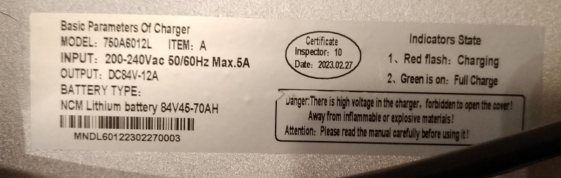 Die Ladeschlussspannung ist angegeben mit 84V - im Gegensatz zu den 83V, die Supersoco für das Ladegerät angibt. Nach Abschluss der Ladung wechselt die LED von rot auf Grün und der Lüfter hört auf mit drehen. Wenn kein Akku angeschlossen ist, blinkt die LED abwechselnd rot und grün.