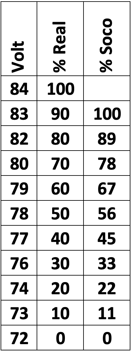 Hoffe das ist soweit richtig. Also habe ich mir eine Tabelle gemacht von 72V bis 84V also 0 bis 100%