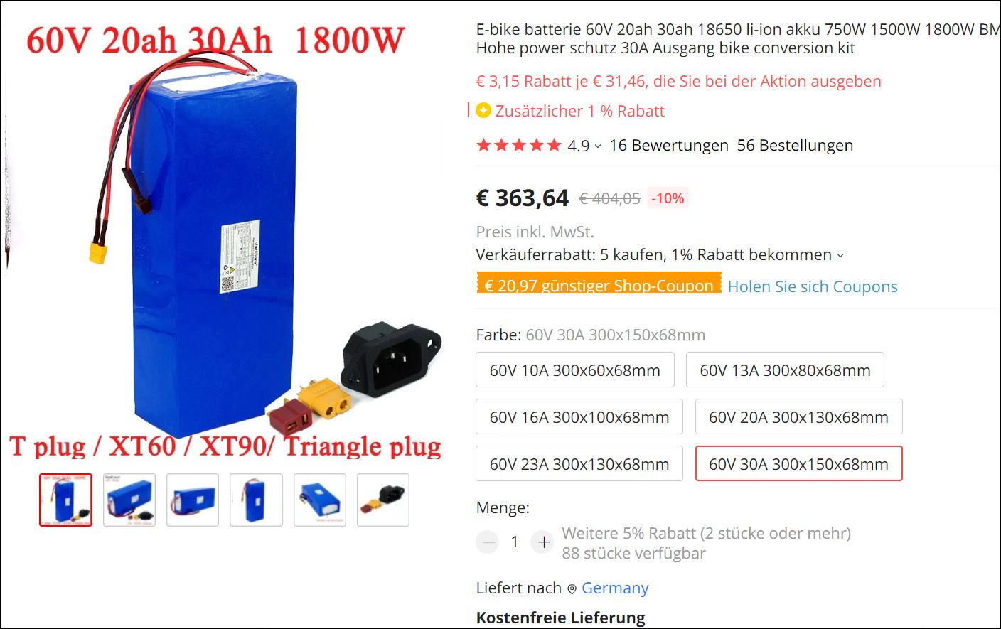 Die schreiben im Angebot natürlich 60 Volt (aufgerundete Rechnung 3,7Vx16=59,2V), weil der ja auch mit 67 Volt vollgeladen wird. Unter hoher Stromlast liegen im Mittel aber vielleicht nur um die 56 Volt an. Daher empfehle ich bei der Umrüstung von Blei auf Lithium am 60 Volt-Roller eher 17s-Akkus deren nominelle Nennspannung über 61 Volt liegt und bei Last nur knapp unter 60 Volt.
