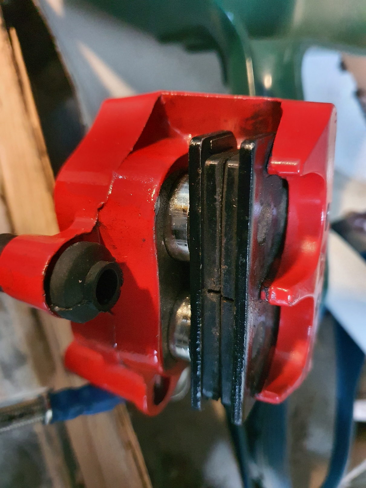Die Bremskolben müssten total ins Gehäuse zurückgedrückt werden können, sofern das Flüssigkeitsrerservoir geöffnet bzw. nicht überfüllt ist.