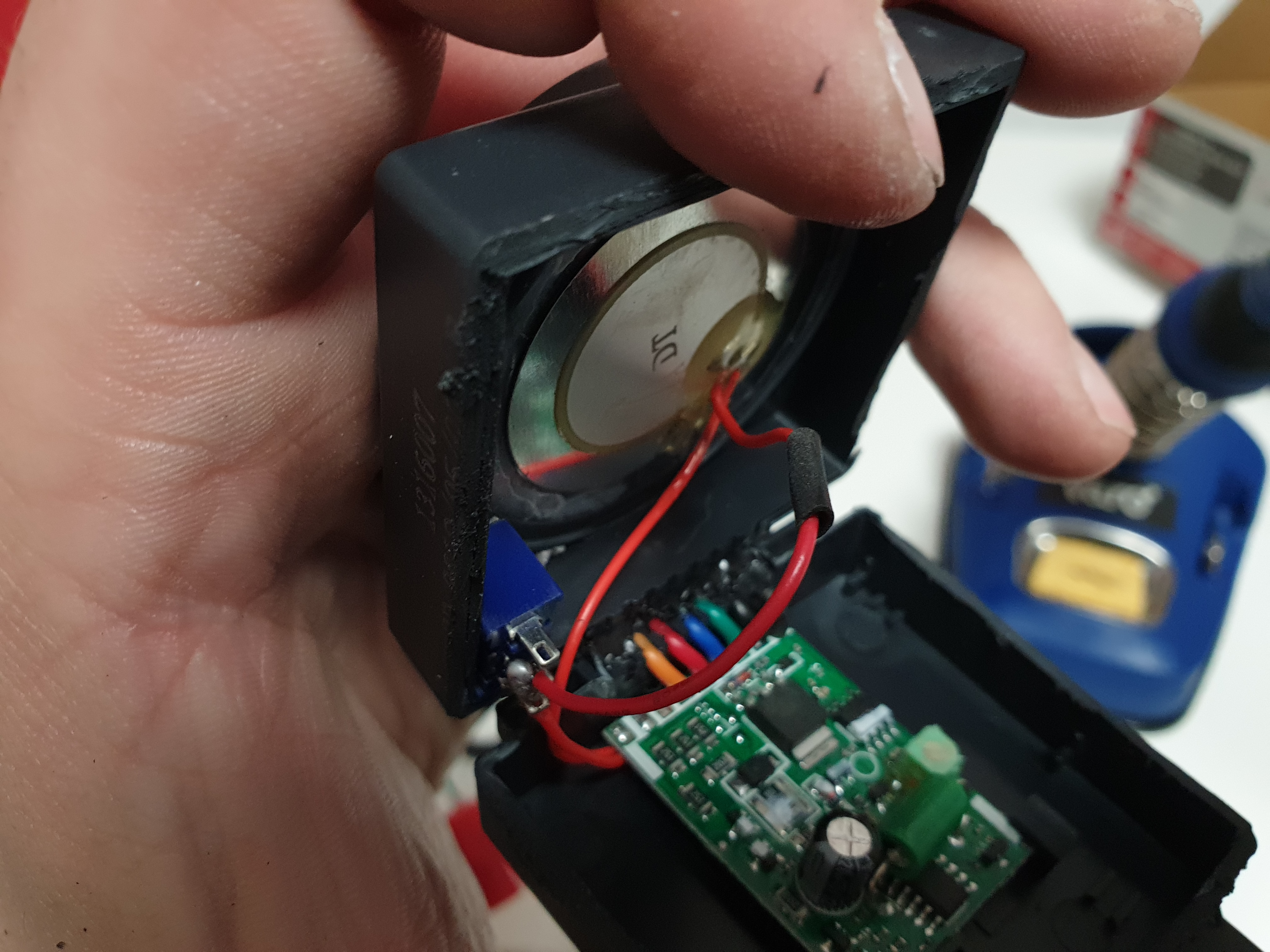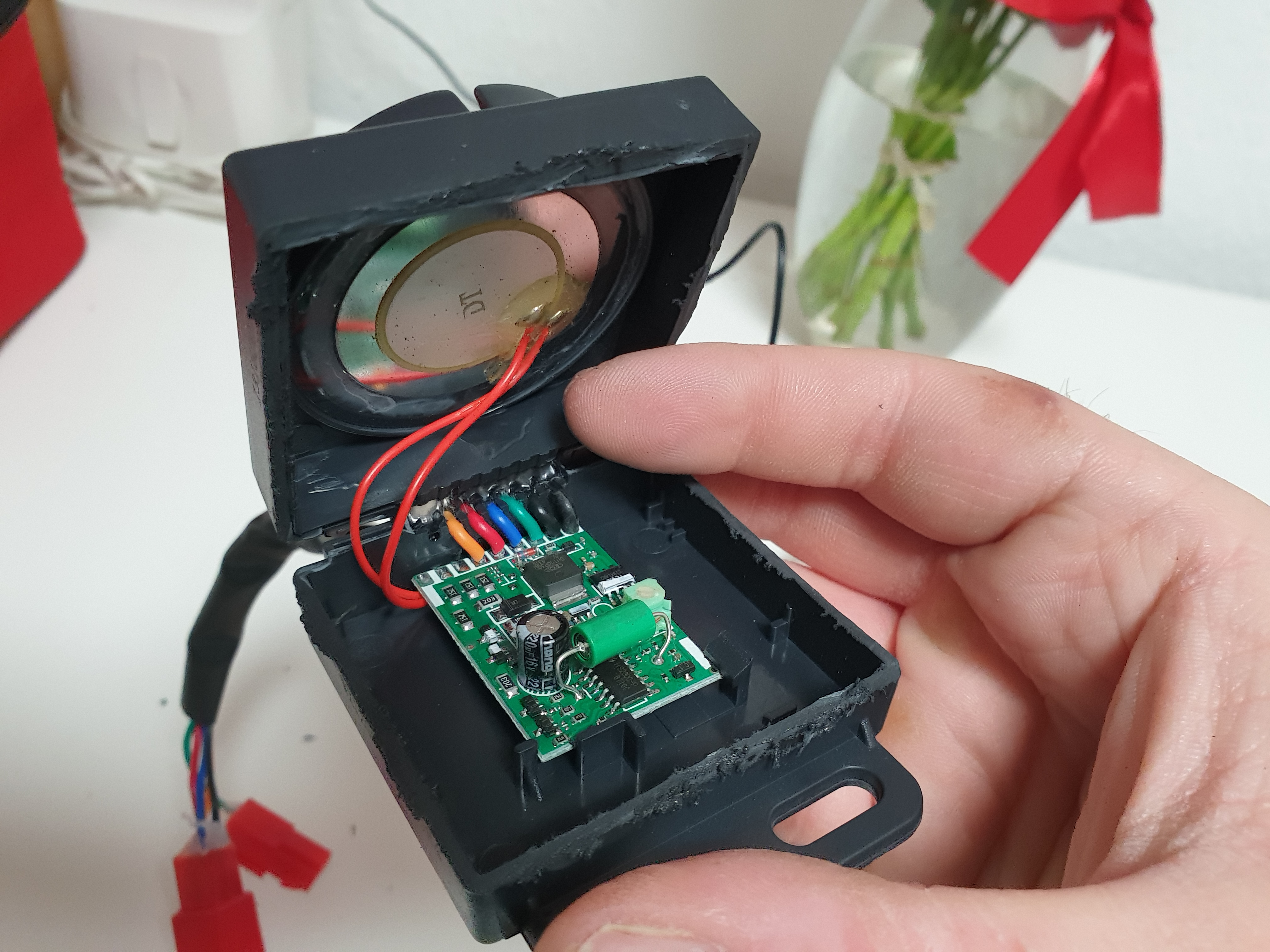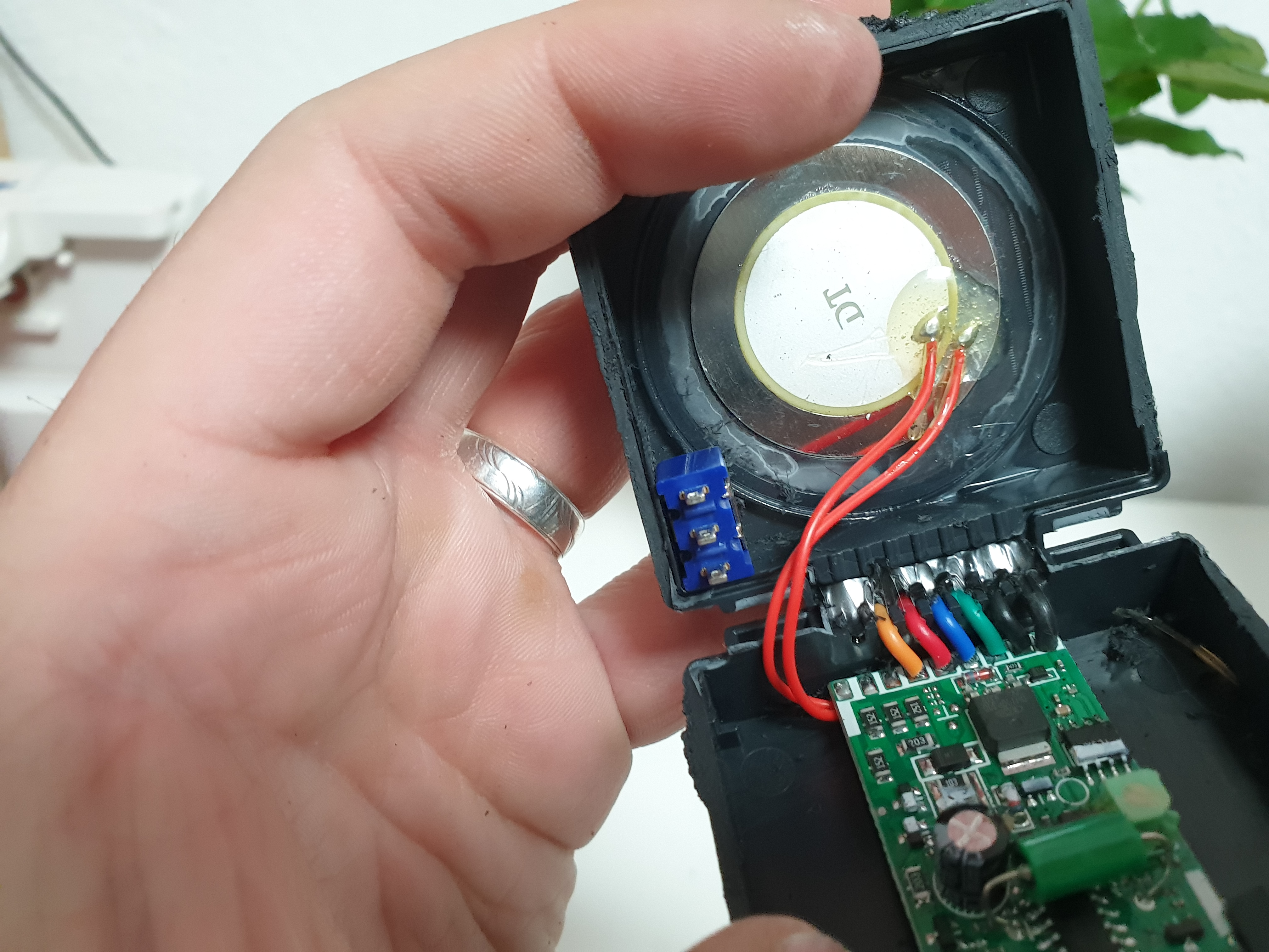 Wenn das Gehäuse geöffnet ist, sieht man die beiden roten Leitungen zu dem Lautsprecher.