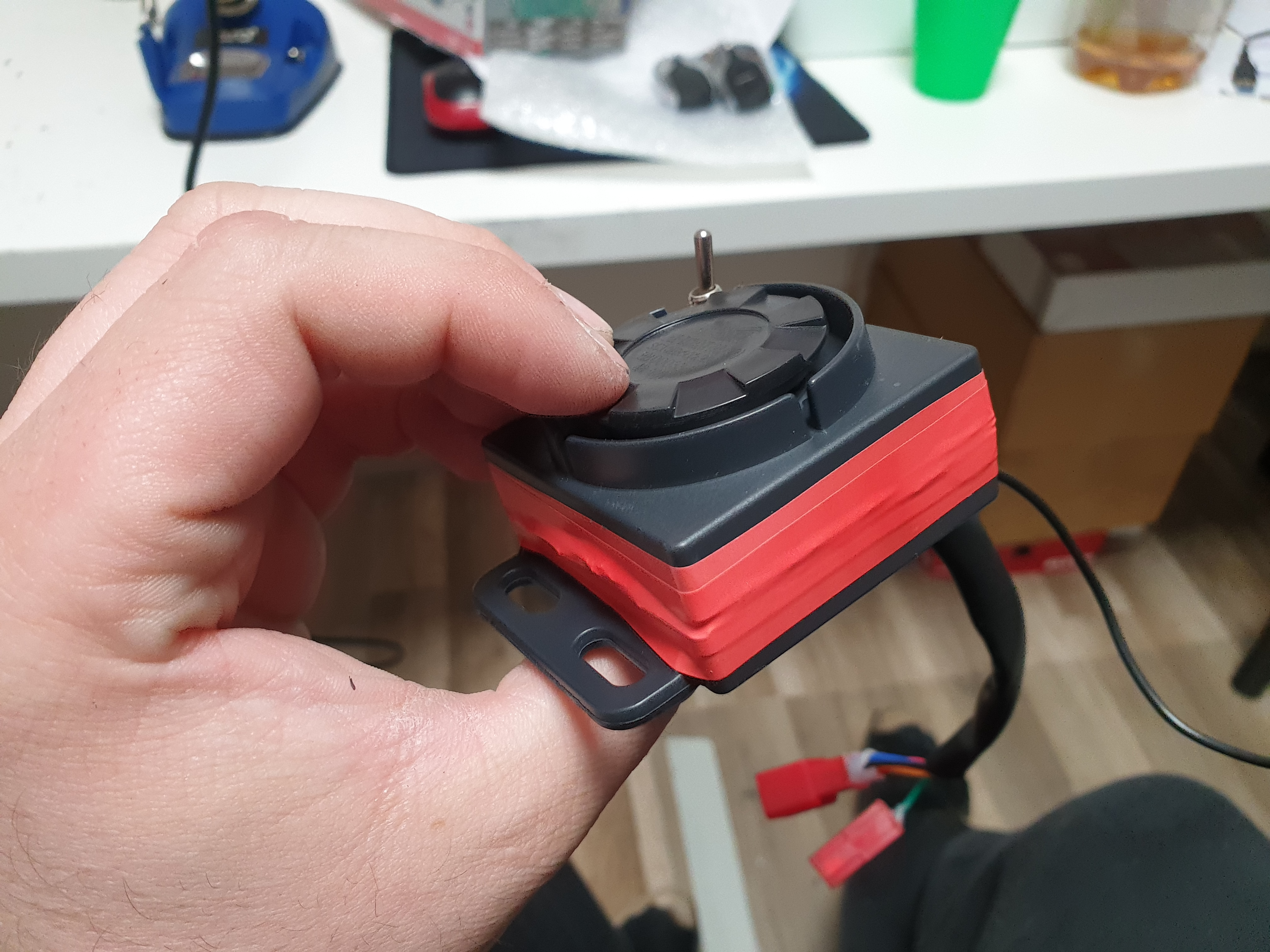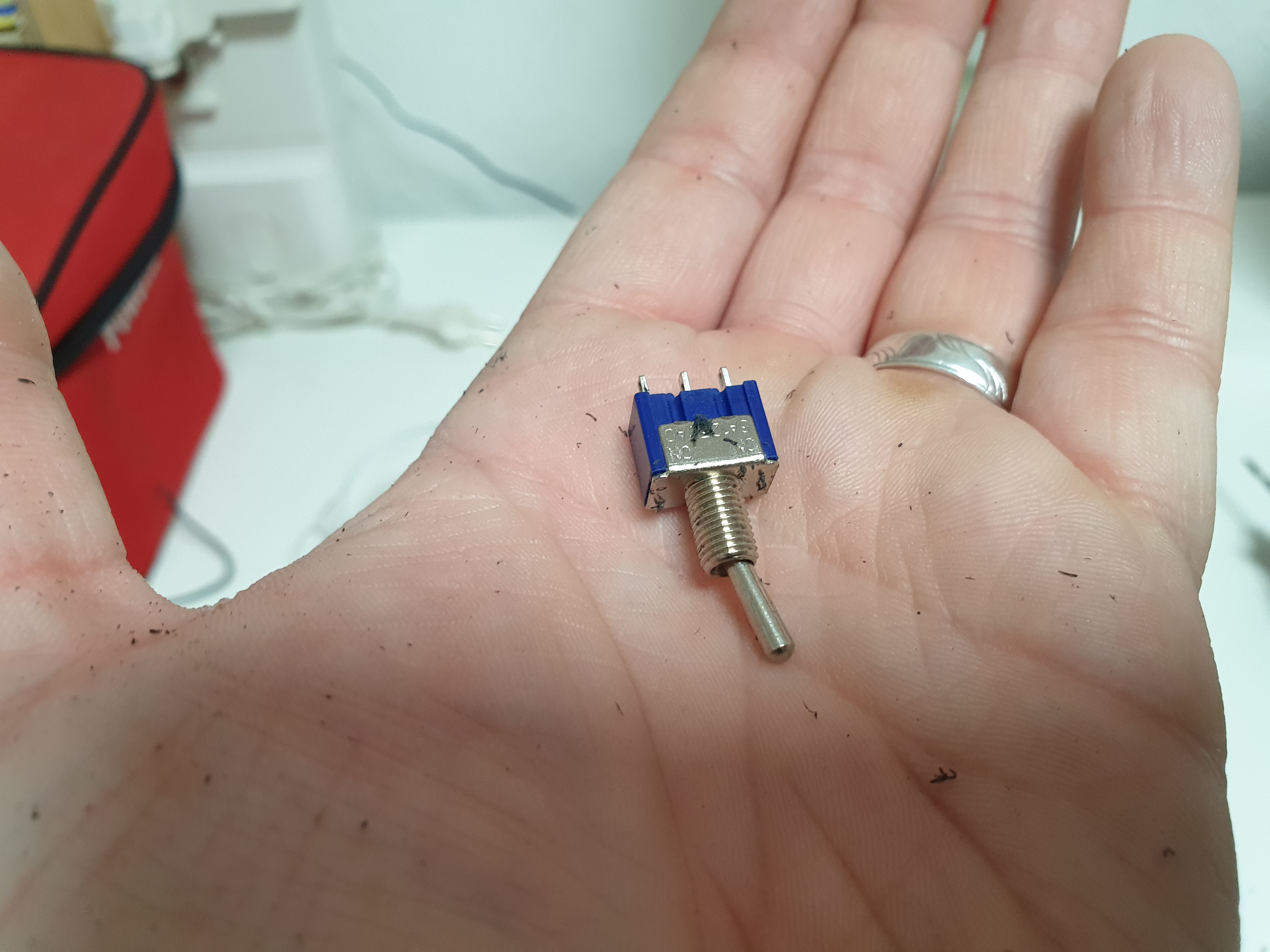 Zum Montieren habe ich ein Loch groß genug für den Schalter gebohrt. Anschließend habe ich oben auf der Oberseite ein Teil des Randes entfernt damit die Kontermutter platz findet.