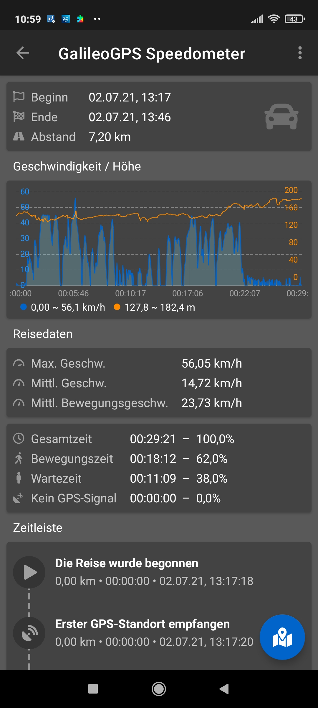 Hier noch ein Screenshot aus der GalileoGPS App. Hier war allerdings der Luftdruck vorne 1,8 und hinten 2,2 Bar. 56 Km/H in einer flachen 60er Zone gemessen und schön warmes Wetter 8-)