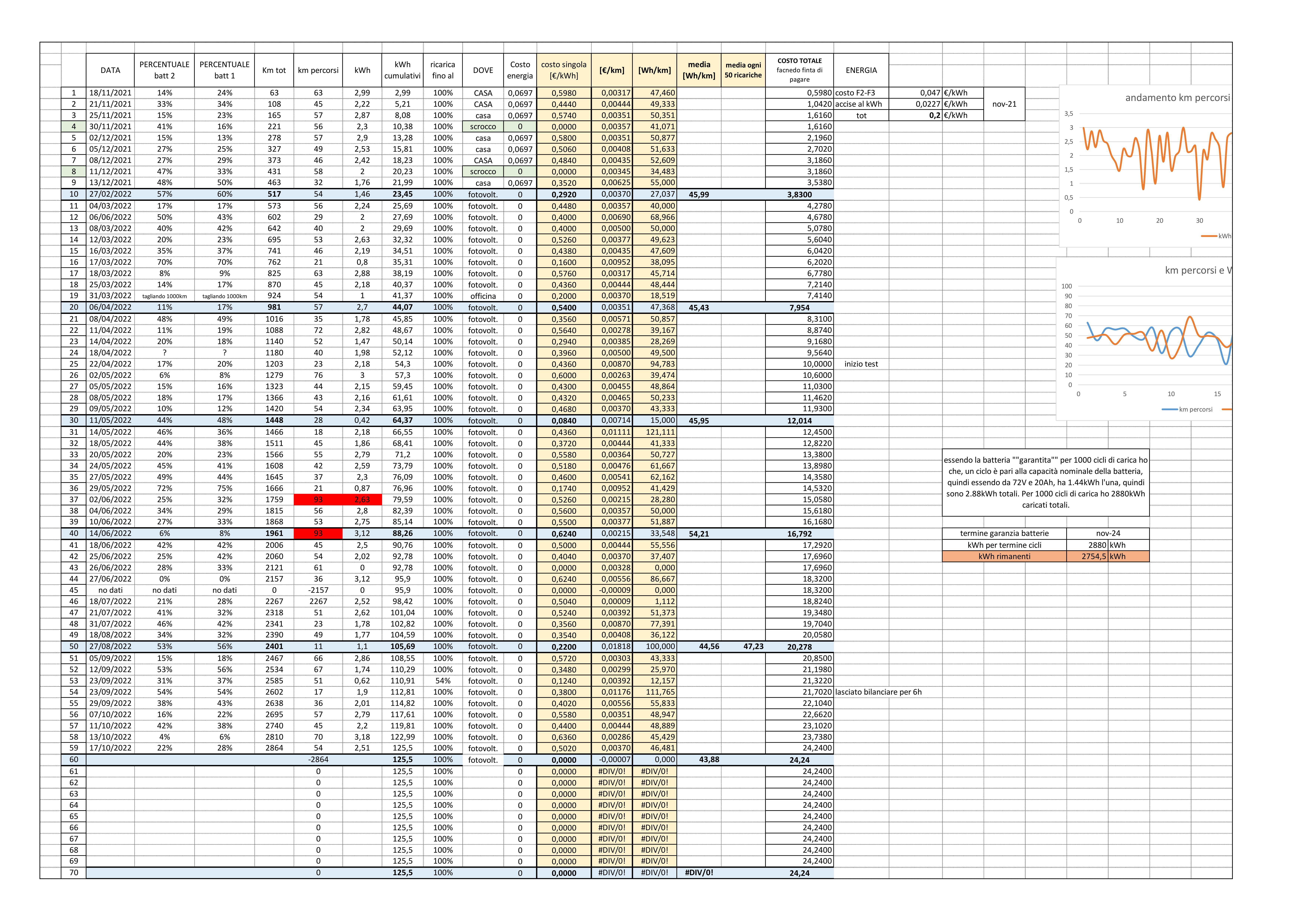 Im Laufe des Jahres habe ich alle meine Aufladungen gesammelt, indem ich die zurückgelegten Kilometer markiert habe, um den Abbau der Batterien nachzuvollziehen.