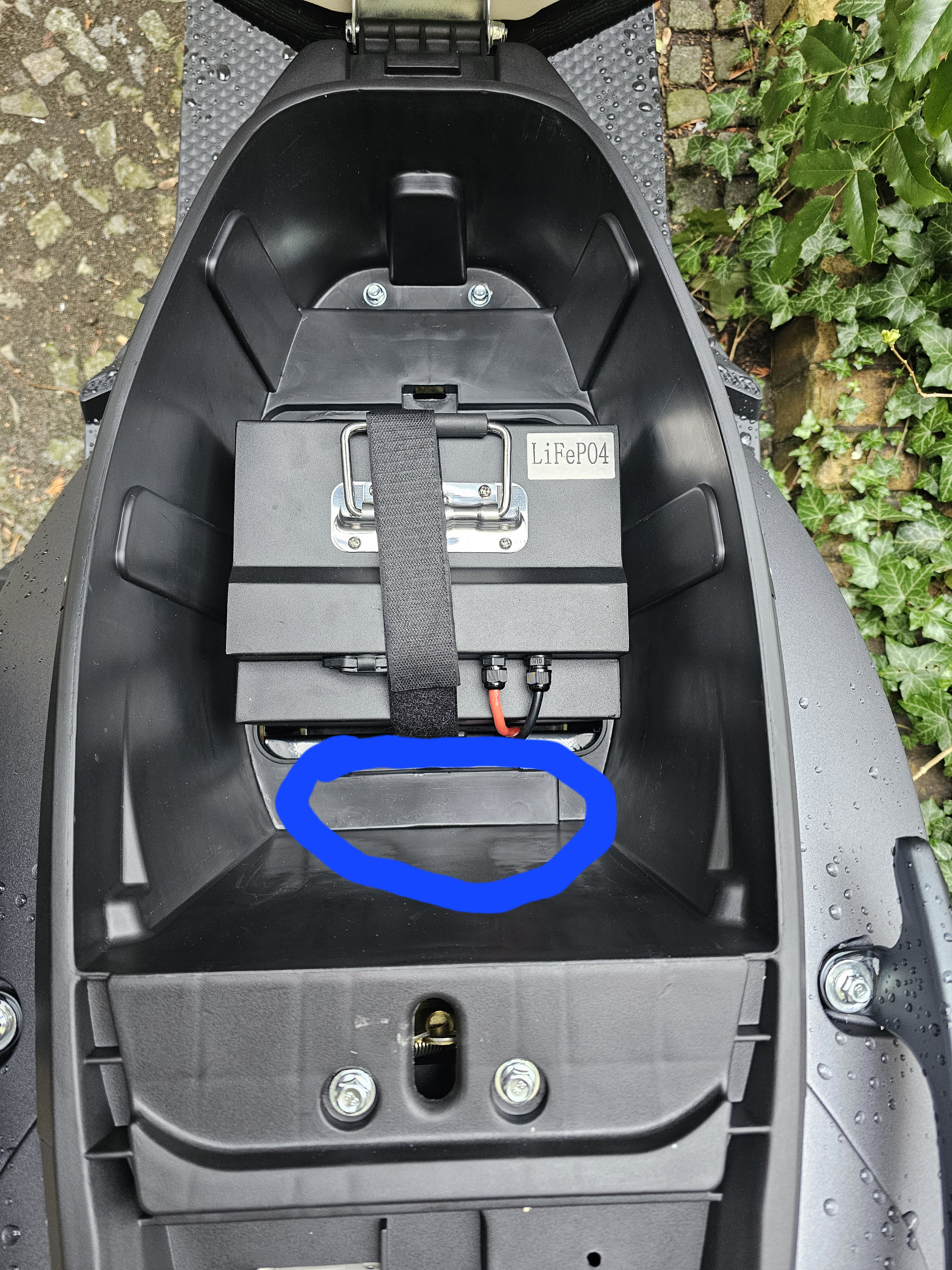 Den Stecker solltest du von unten ganz gut erreichen. Es ist ein roter Anderson Stecker. Bei unserem Vorführer ist das Kabel Rollerseitig lang genug um es anders zu verlegen wenn du den Akku erst mal raus bekommen hast. Um besser arbeiten zu können ist es Sinnvoll die Helmfachverkleidung zu lösen. Diese ist nur an den 4 Schrauben im Helmfach fest geschraubt.