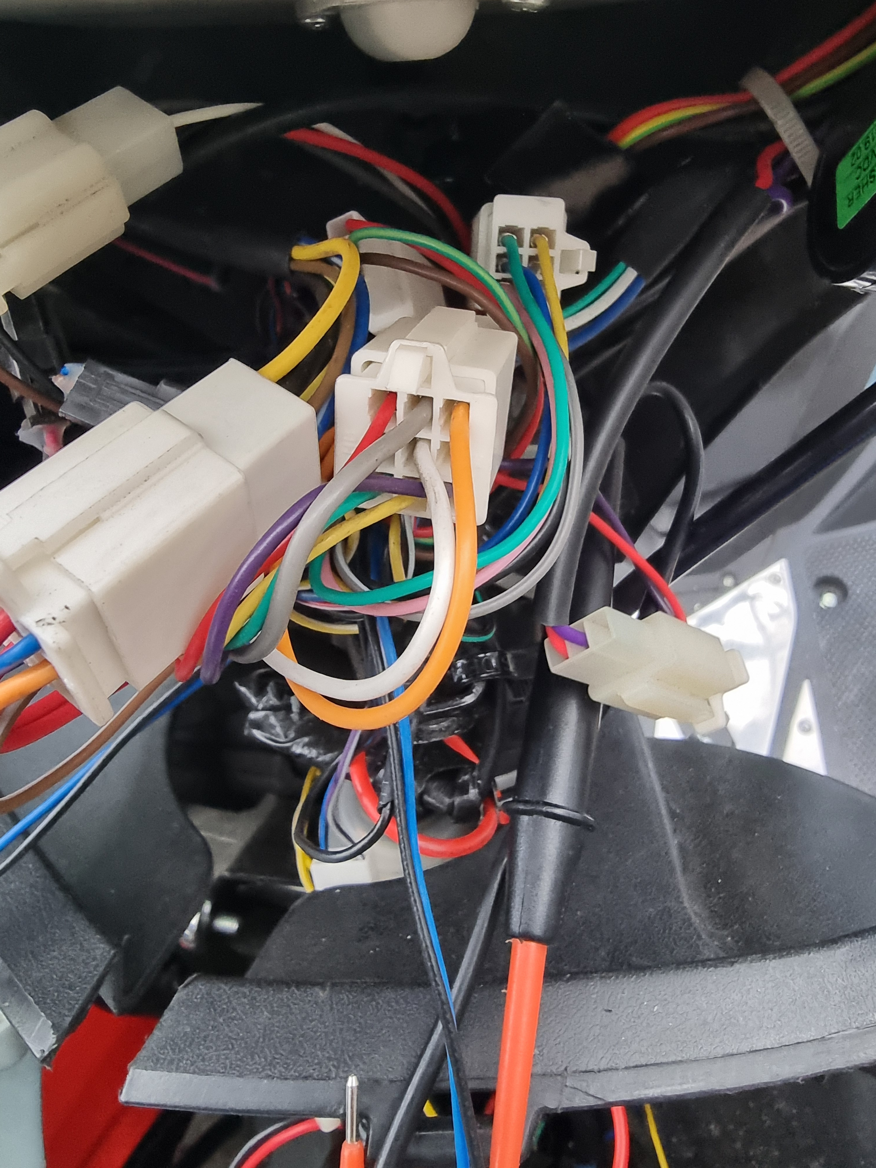 Das weisse kabel im Stecker rechts ist für das Fernlicht. Dieser Stecker führt zum Tacho.Das blaue Kabel ist für das Lichtsymbol zuständig.