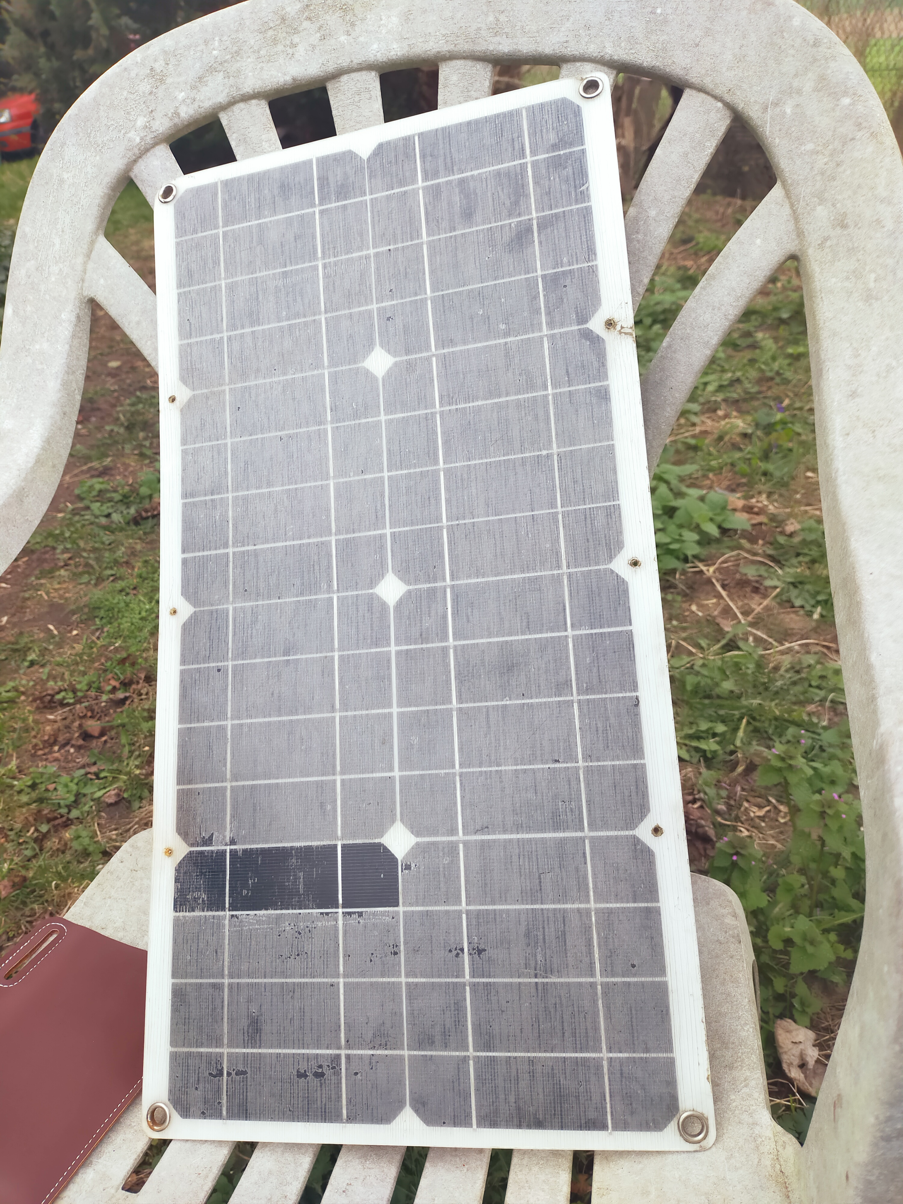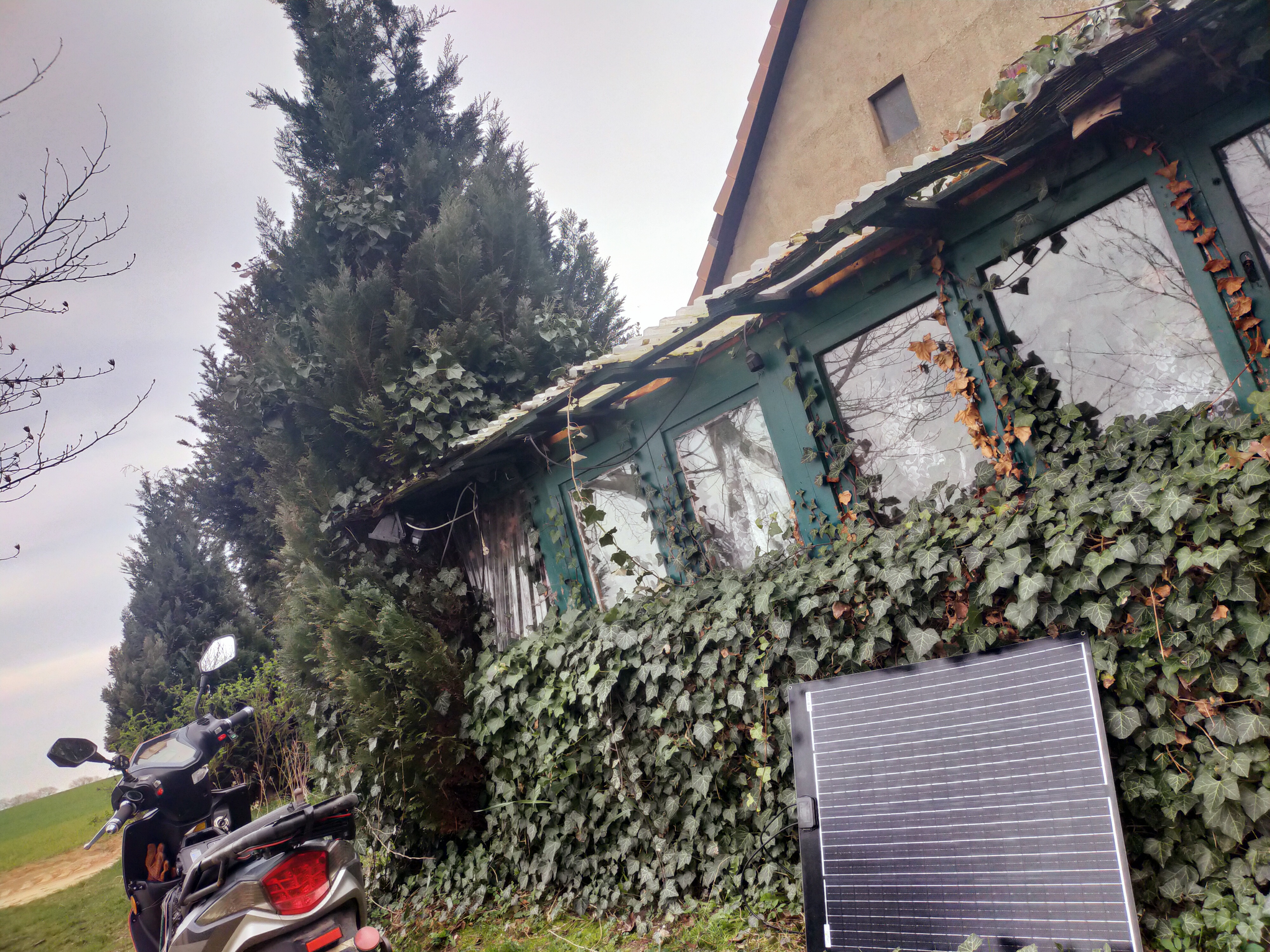 Ich hoffe nützliche Informationen betreffs eines Solarmoduls, welches mit einem Elektroroller mitgeführt wird, zu liefern. Jetzt, um 12:10 Uhr, ist es immer noch stark bewölkt, aber die Sonne liefert schon etwas Streulicht zwischen den Wolken hindurch, sodass der Ladestrom 0,4 A, auf der selben Stelle auf dem Parkplatz stehend, beträgt.