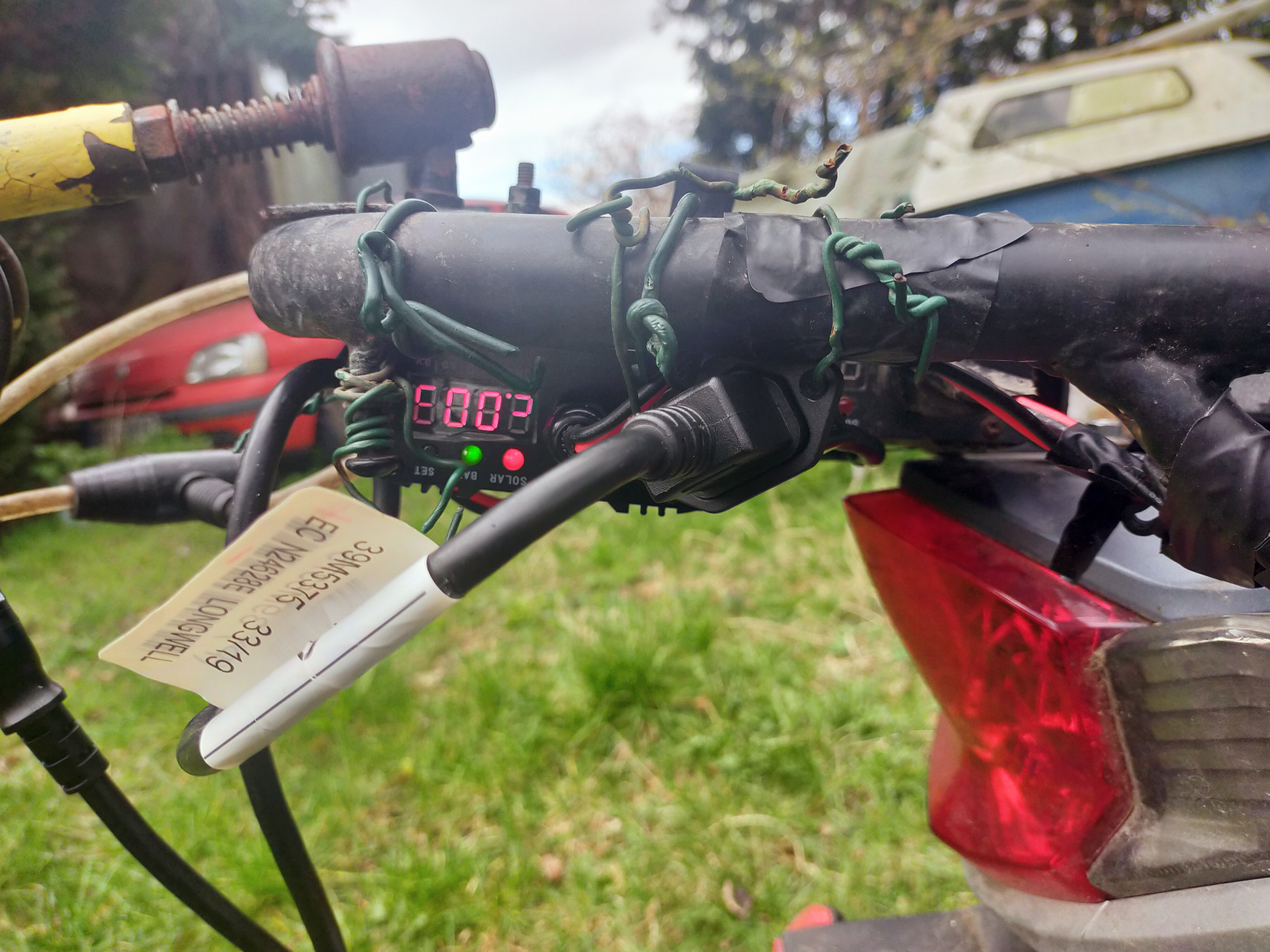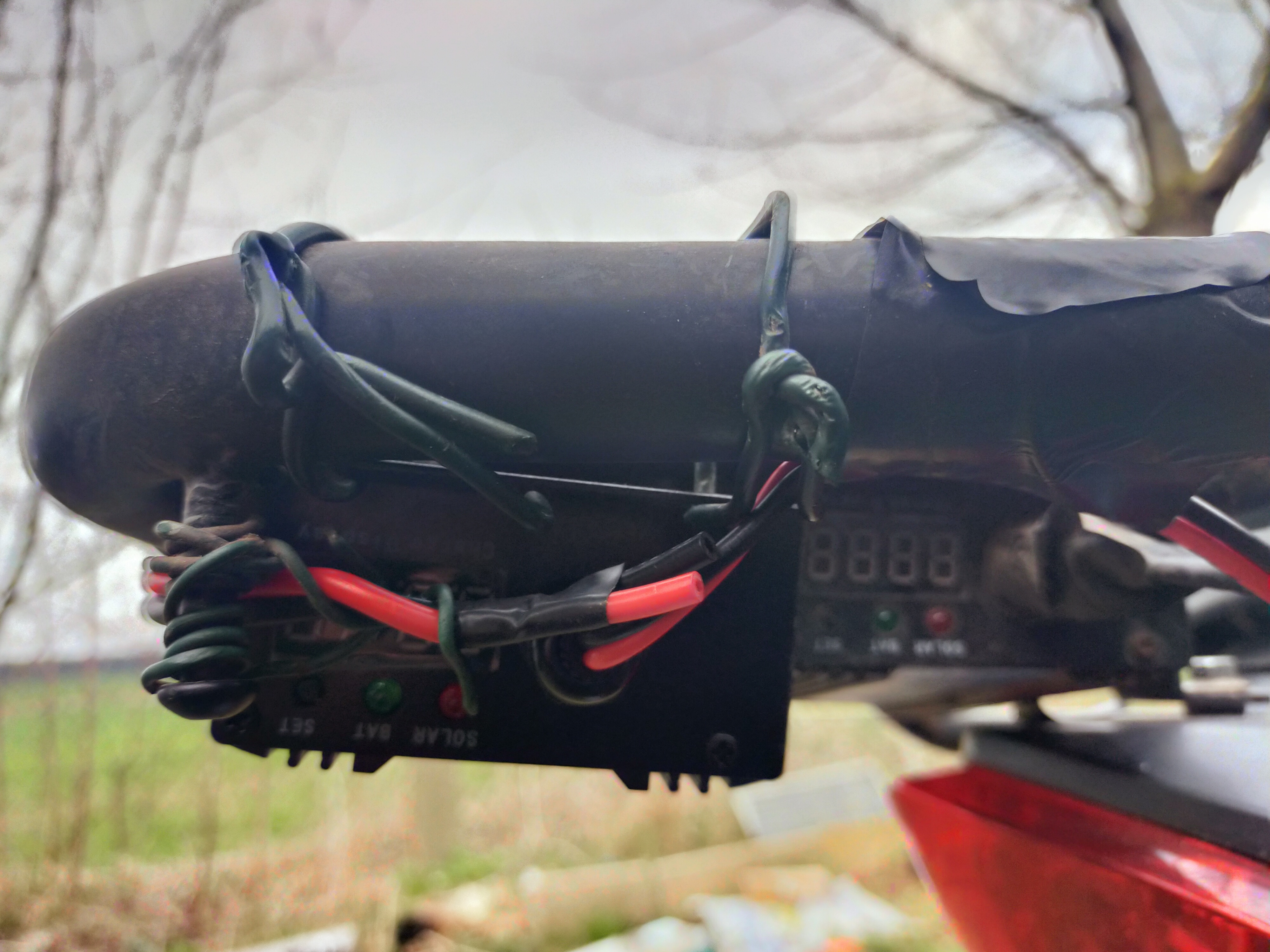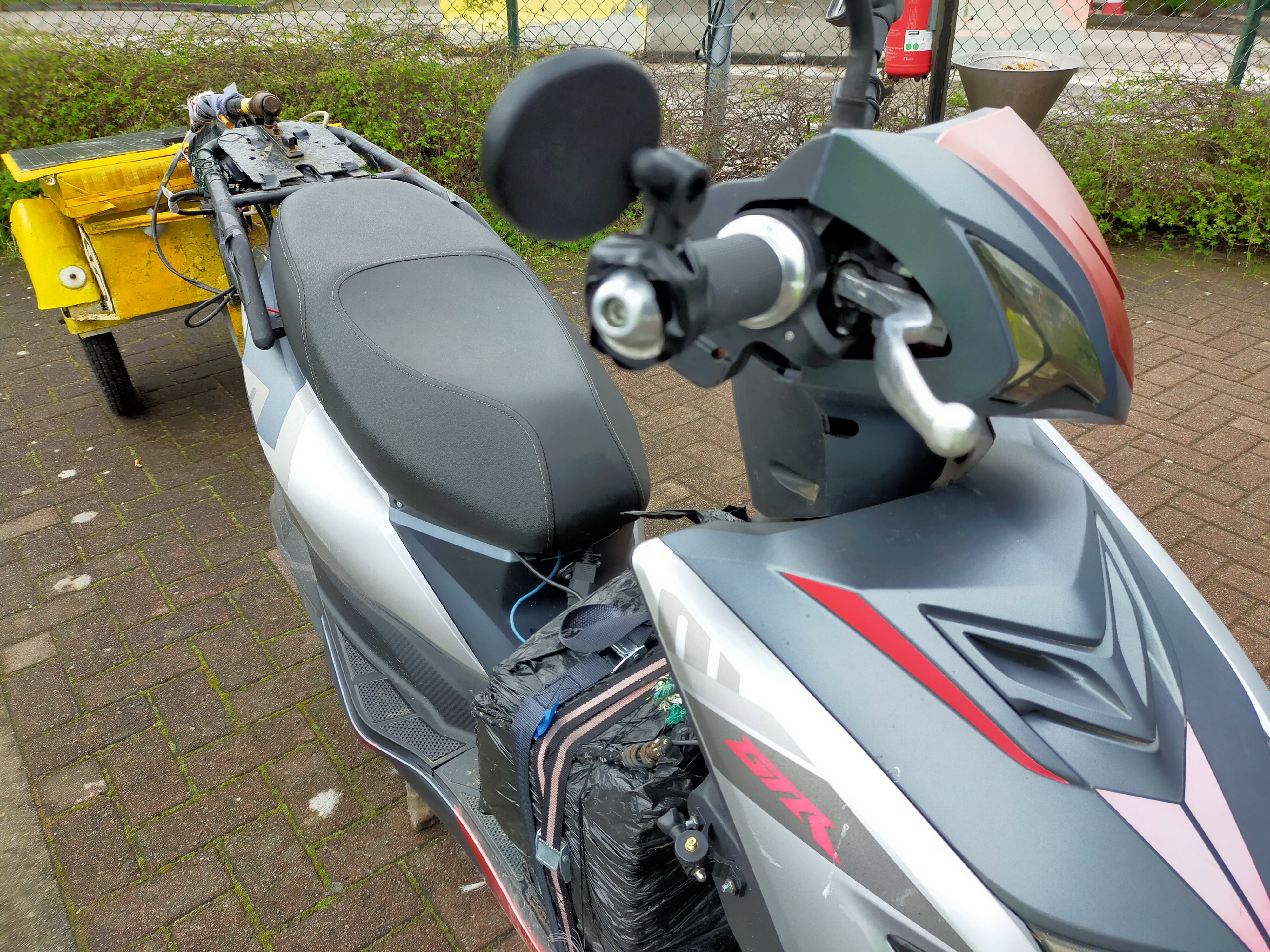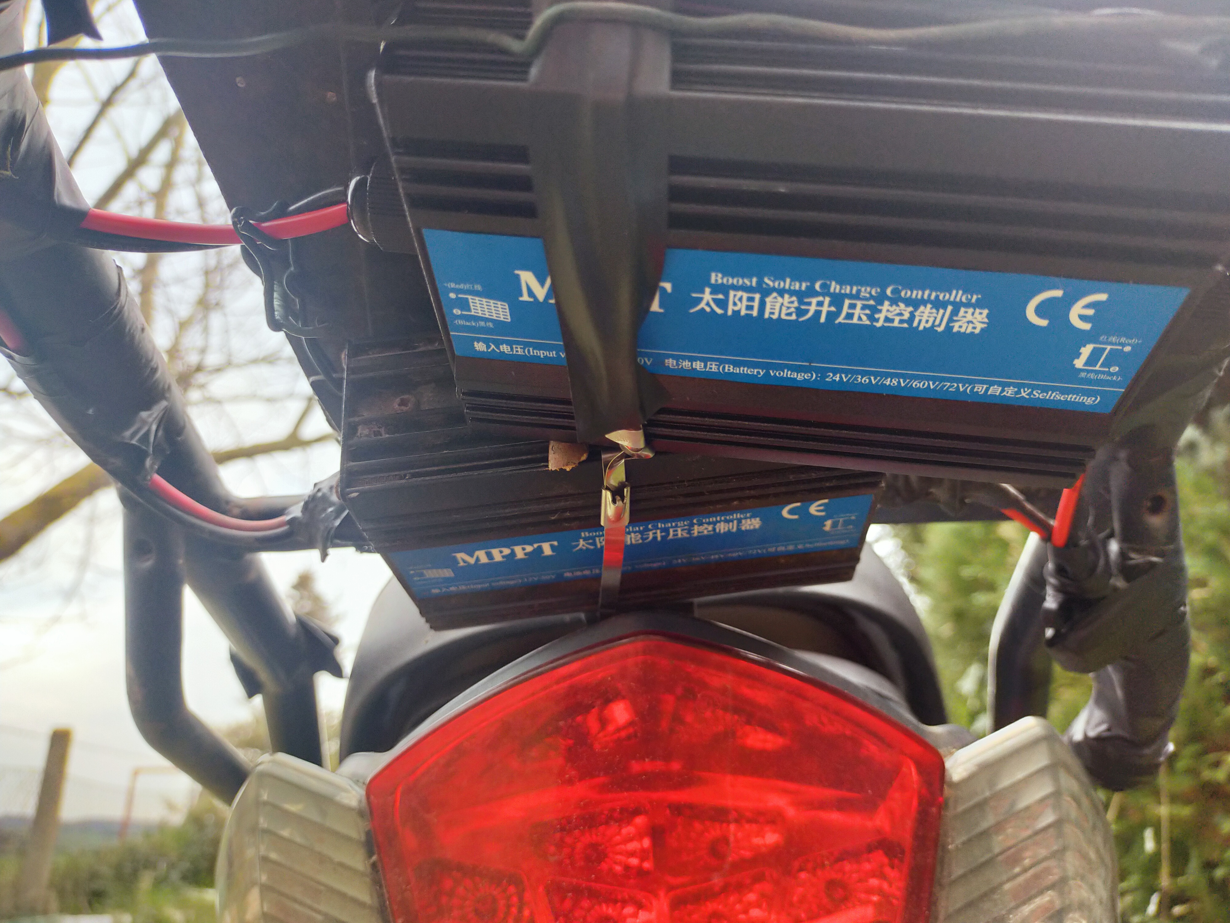 Ich werde folgende Zeilen für Interessierte schreiben, die auch Solarmodule auf ihrem Elektroroller anbauen möchten. Die zwei 12 V zuvor verbauten Solarmodule und Haltegitter habe ich abgebaut, weil die China Module sowieso nicht so leistungsfähig waren und jetzt an der Anschlußdose ein Kabelbruch vorliegt und die Moduloberflächenfolie komplett durch das Sonnenlicht, nach etwas 3 Jahren, beschädigt. Mann müßte diese oberste Schicht abbürsten, um die Plastereste zu entfernen. Zwei Module in Reihe geschaltet gewesen, MPPT boost step Up Laderegler verwende ich weiter. Zusätzlich habe ich einen Bauartgleichen angebaut ,der ebenfalls auch 72 V Nennspannung, also fast ca. 88 V Spannung zum Laden der 62 Ah 72 V Bleigelakkubank. Der Umbau wurde auch nötig, weil ich die Anhängerkupplung meines baugleichen anderen Leo jetzt auf diesen angebaut habe. Jetzt mußich noch ein neues Haltegitter für das 24V, größere 100 W Modul des deutschen Herstellers offgridtec bauen.