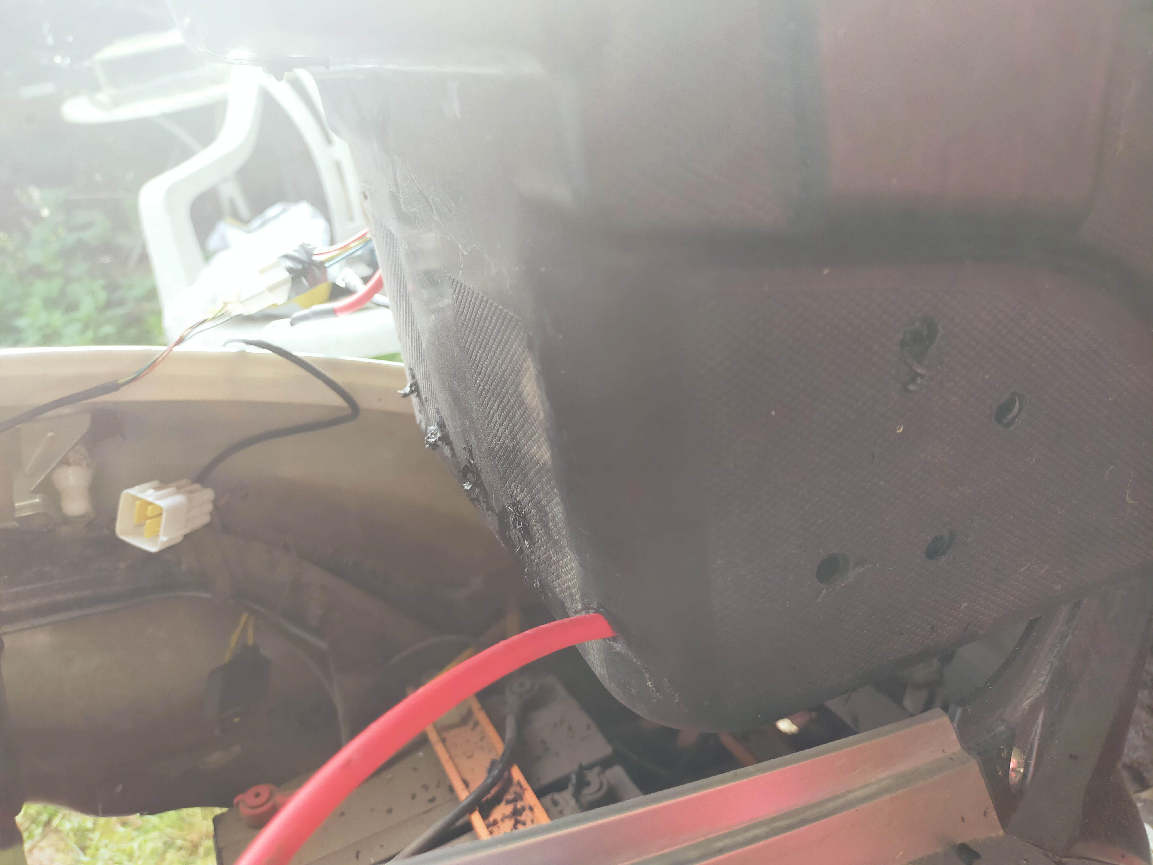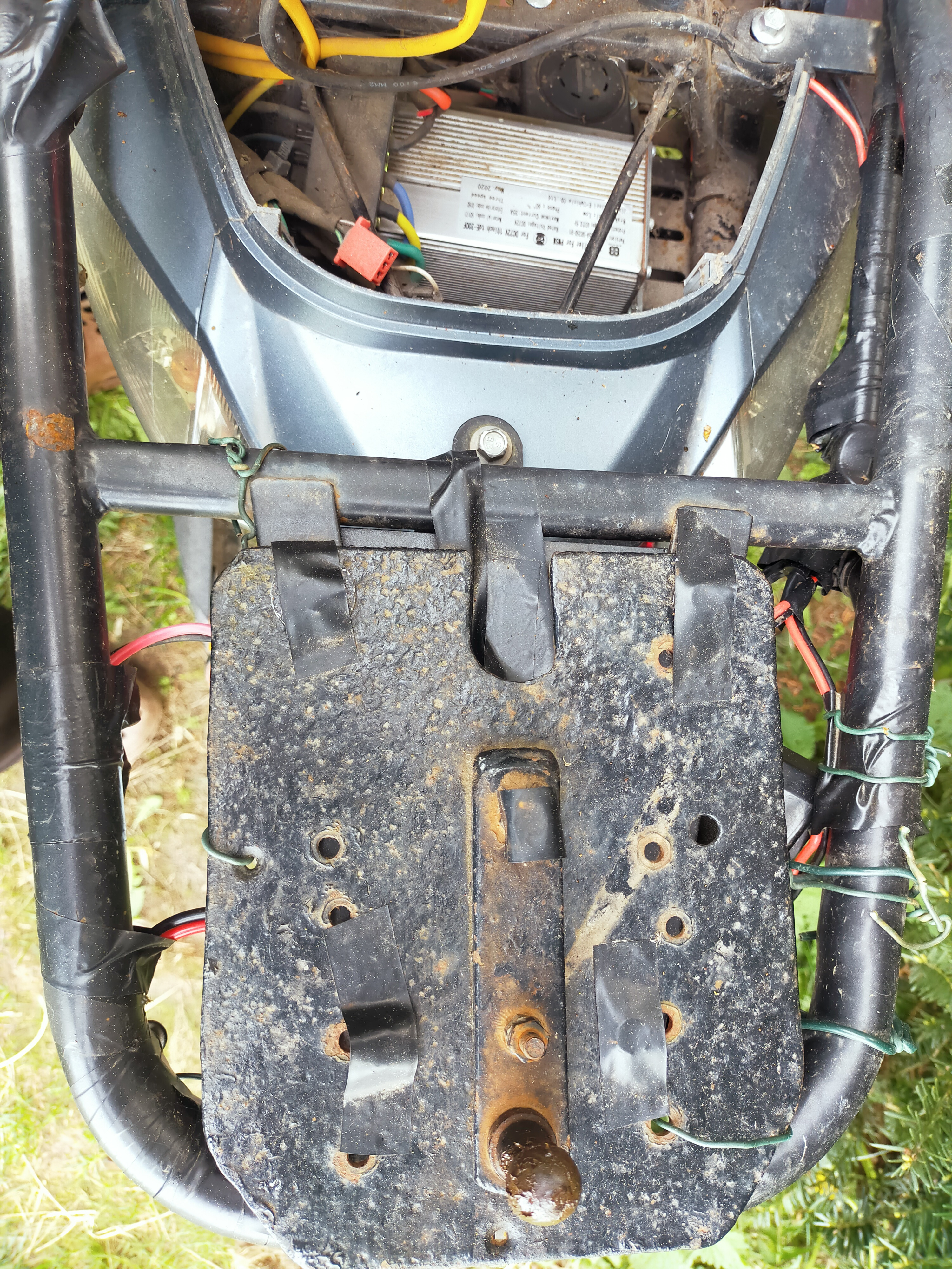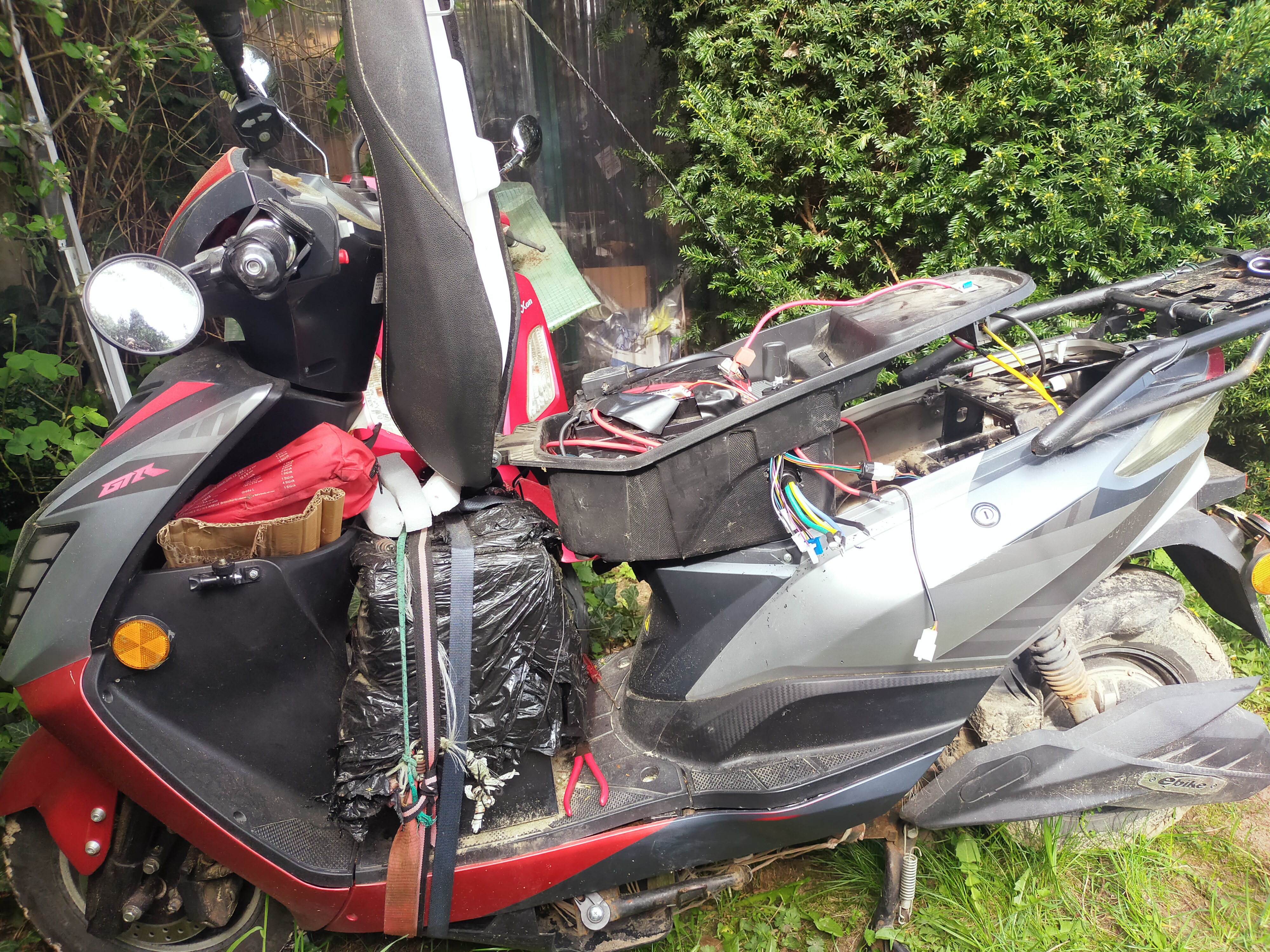 Für Interessierte füge ich folgende Foto hinzu. Heute habe ich mehrere Löcher zwecks Belüftung und ein großes Loch zur Kabeldurchführung in die Sitzwanne gebohrt. Die Befestigungsmetallschienen des Controllers habe ich mittels Zange und Hammerschläge umgebogen, damit der Controller in die Sitzbank passt. Die nächsten Tage werde ich die Verkabelung beginnen, denn jetzt muß ich ja bald zur Arbeit mit meinem zweiten Elektroroller Leo fahren.
