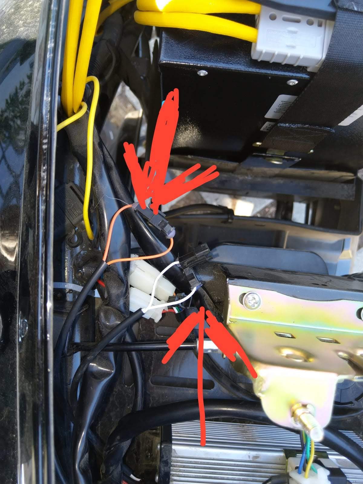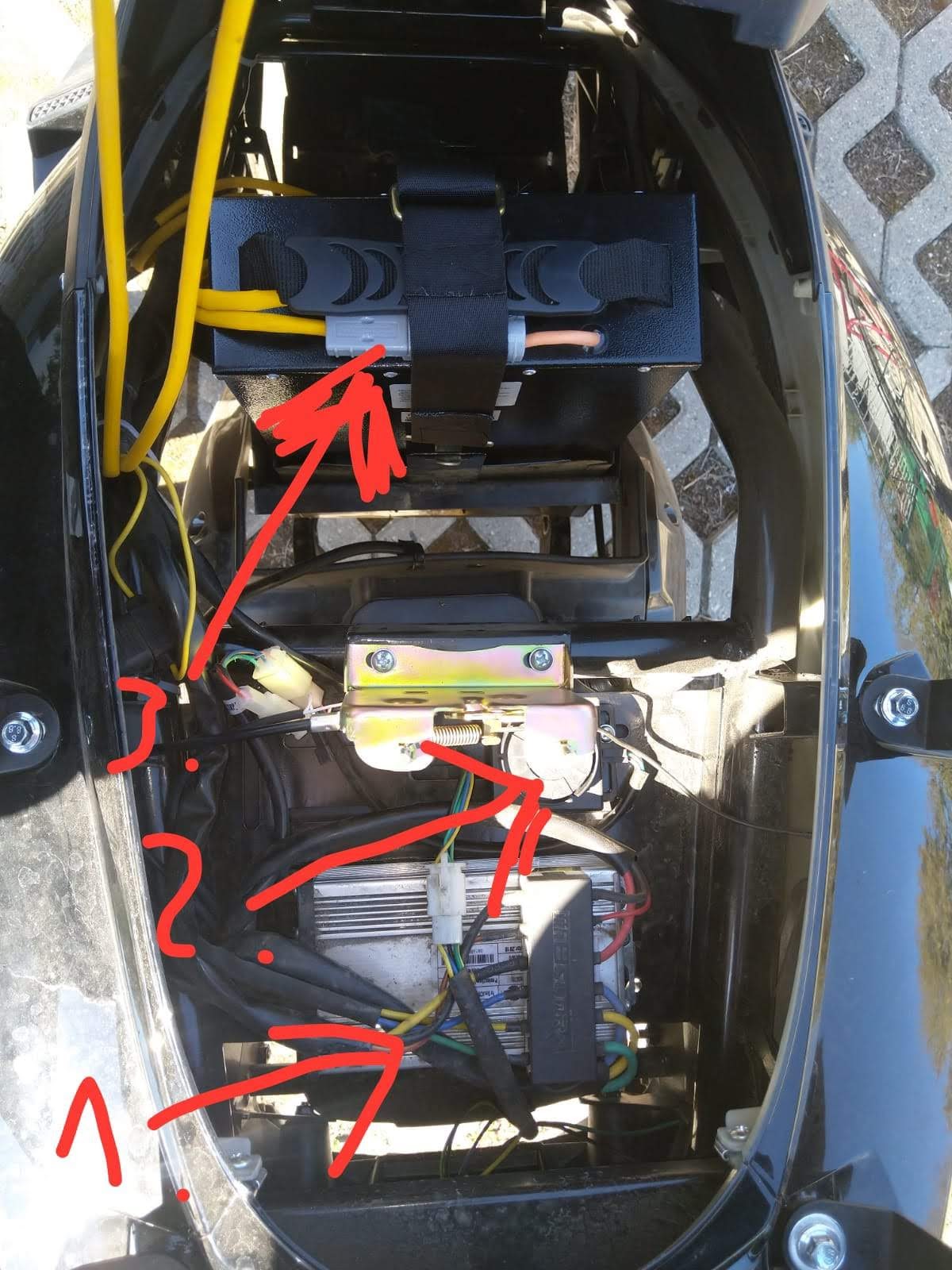 Sollte also der Roller bei Auslieferung nur so langsam fahren, dann... Roller Helmfach ausbauen ( nur 4 x 10er Schrauben/ Muttern raus) und die weißen Kabel an der Steckverbindung trennen... Und schon fährt er schneller!