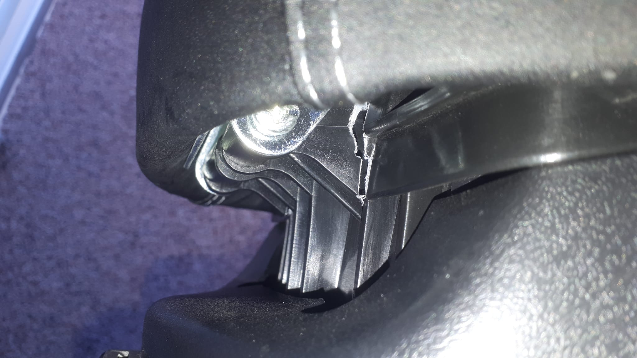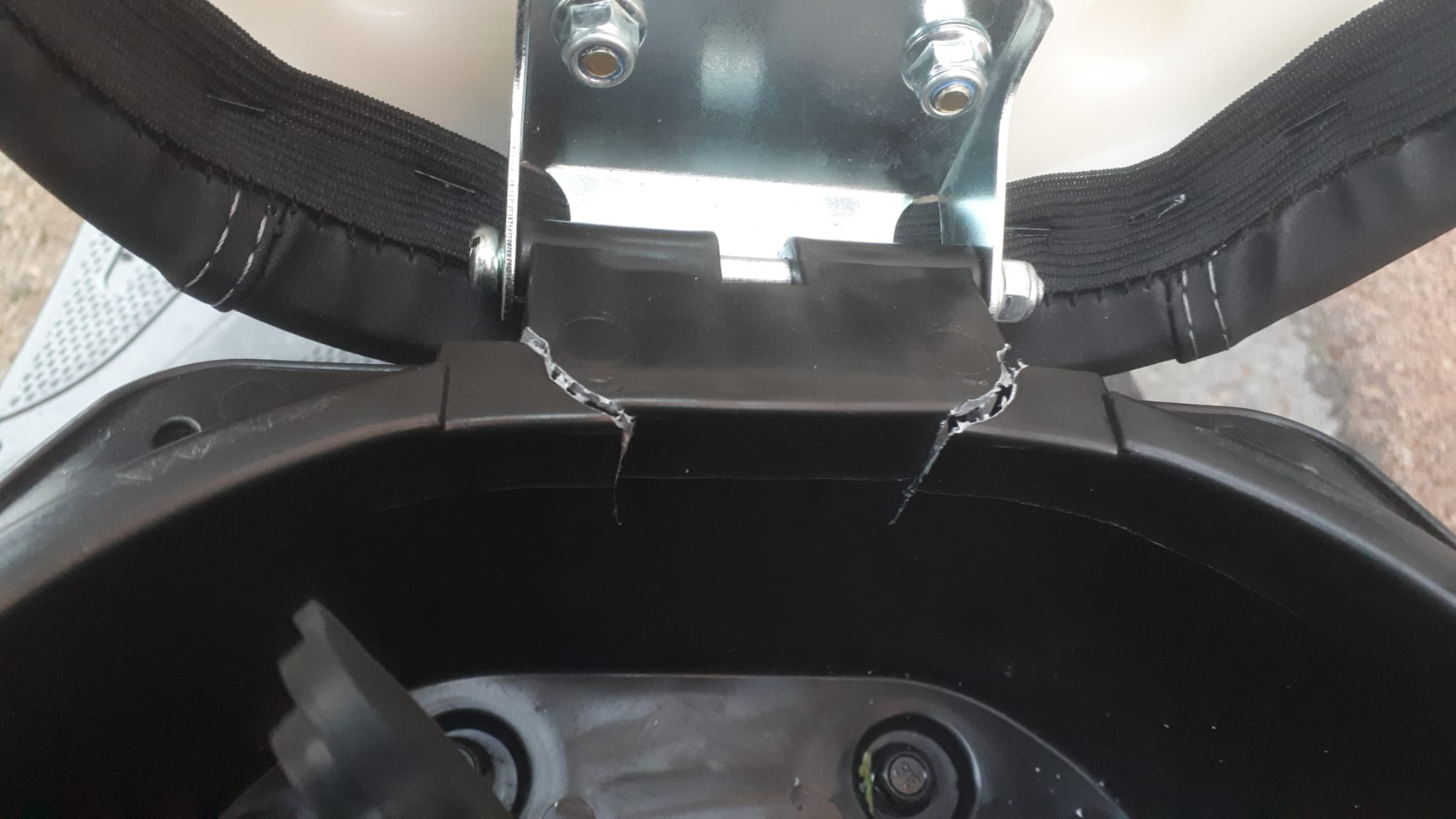 In der Zwischenzeit hat mich eine weitere Erstserienkrankheit erwischt: Das Plastik der Sitzschale am Scharnier hat Risse, siehe Fotos im Anhang.