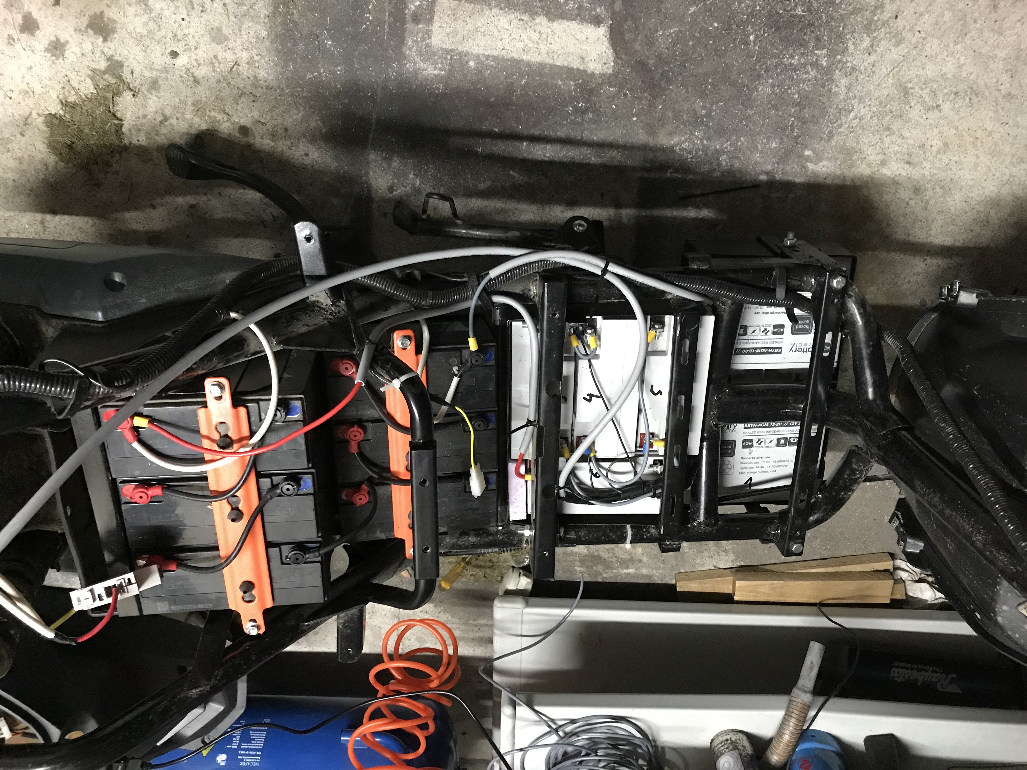 ich habe heute den Rest verkabelt und dann eine kurze Probefahrt gemacht. Elektrisch ist alles gelaufen aber der Batteriekasten ist vorne zu breit und zu tief. In Kurven schrammt der kasten am Boden. Da habe ich die Neigung