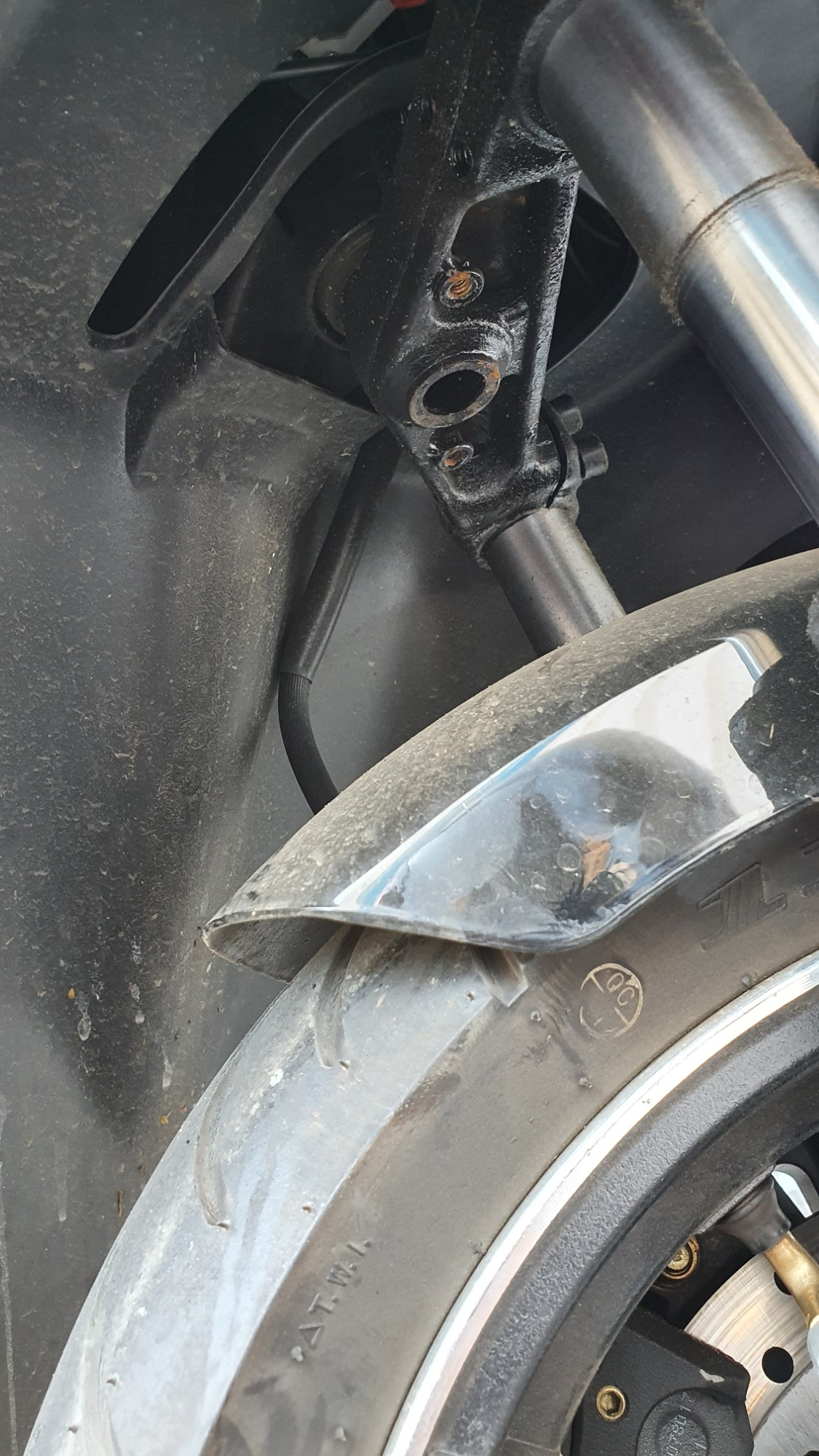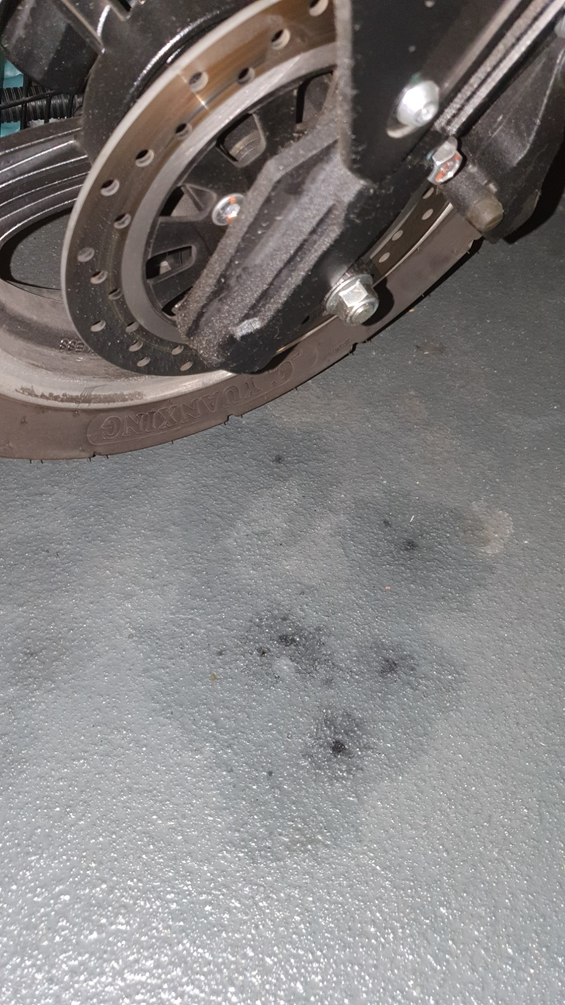 Seit einige Wochen habe ich bemerkt, dass etwas im Bereich meines Vorderrads undicht ist. Auf dem Boden, wo ich den Roller abstelle, sind einige Flecken