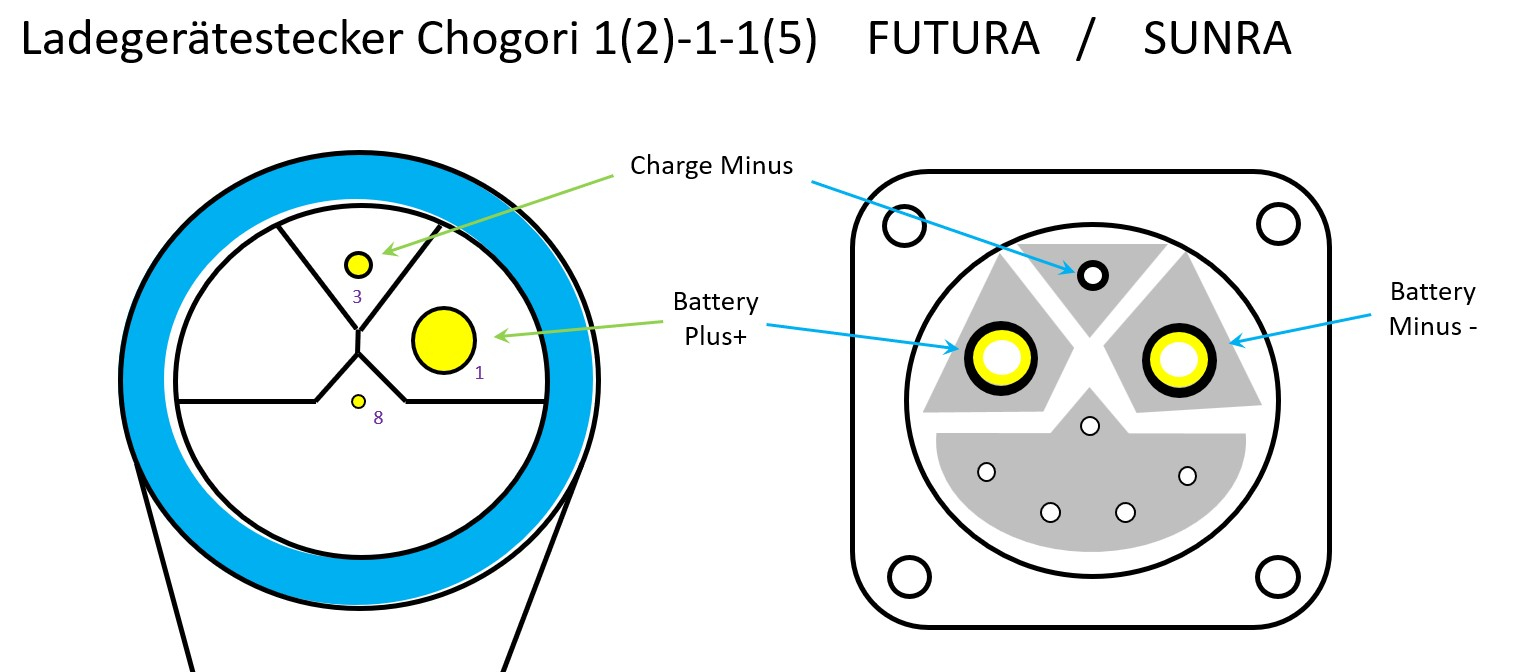 Du kannst also im Prinzip jedes Ladegerät für 20s LiIon (72 V Nennspannung/Ladeschluss bei 84 Volt) benutzen, wenn Du einen Chogori 2-1-5-Stecker anbringst, bei dem die Kabelbrücken auf SUNRA-Akku angepasst sind.