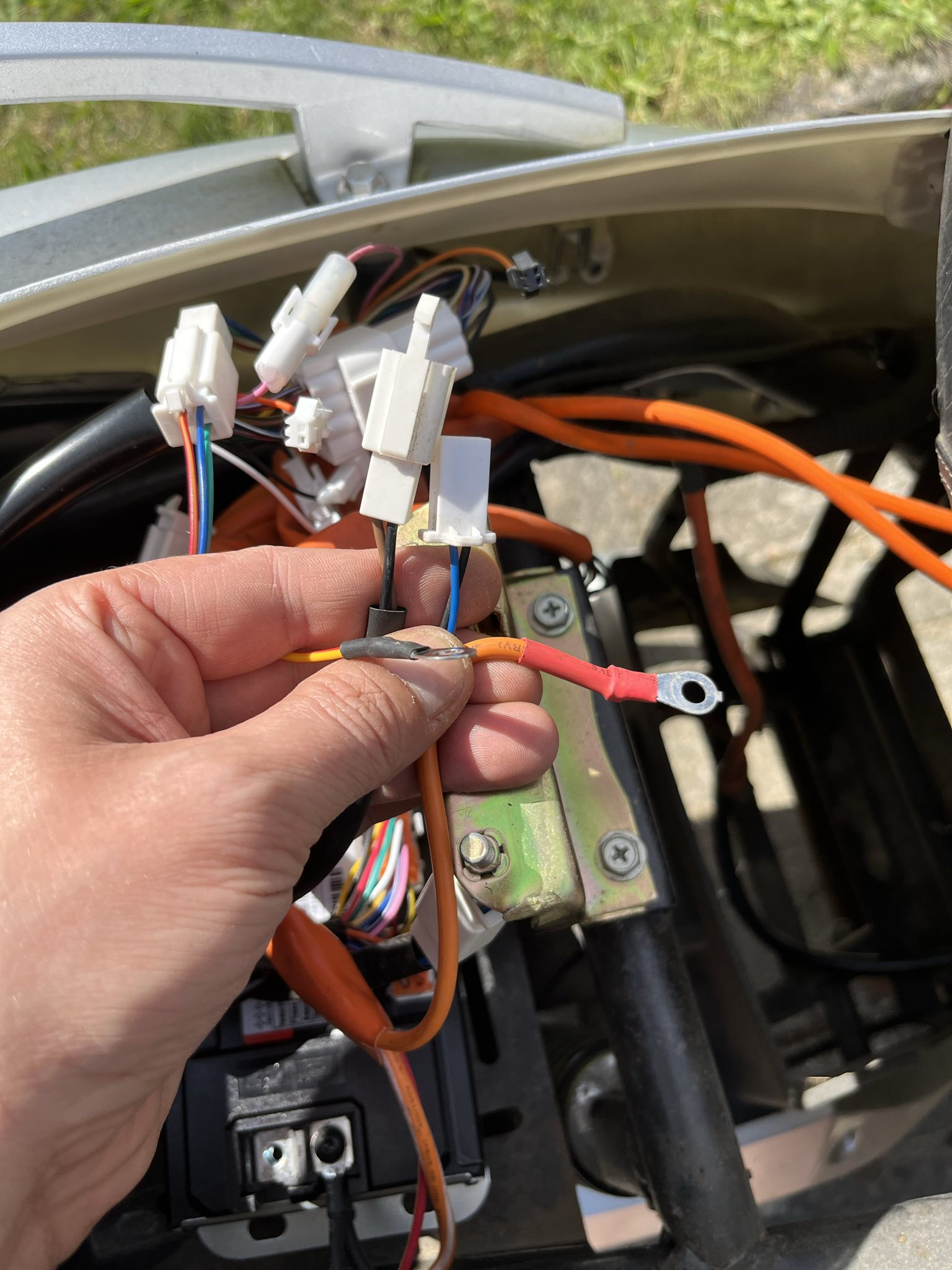 Und jetzt bin ich mal ganz vorsichtig, und rate dir mal zu schauen, wohin das 2. Kabel (das dünne rote) geht. Geht es in den Akku, schaltet es diesen frei. Geht es nach ganz vorne in den lenker, ist es die Zuleitung für den 12 Volt Spannungswandler dort, der dann wiederum die Lampen, Hupe etc. Mit strom versorgt.