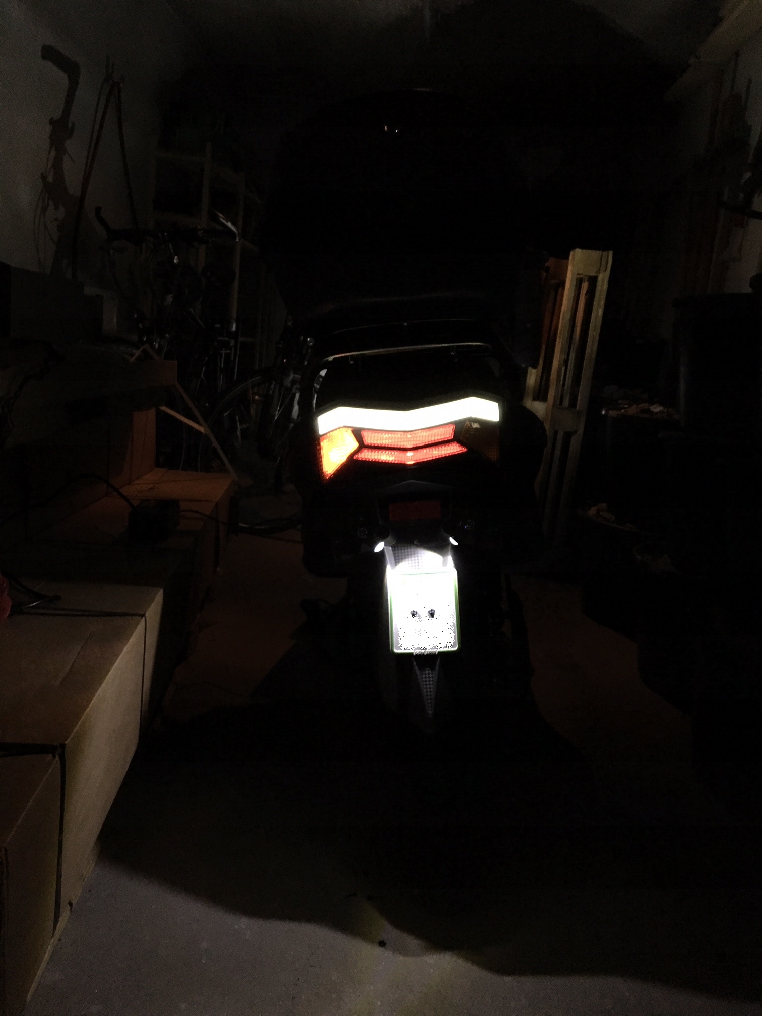 Dieses Modell hat, anders als seine Vorgänger oder viele Mitbewerber, auch LED-Licht. Was für uns mit ein Kriterium für den Kauf war. Dieses ist wirklich hell. Man sieht richtig gut und es hat den Vorteil, dass man selber auch deutlich besser gesehen wird, wenn man es mal dunkel ist. Gerade, wenn man sich mal das Heck im Dunkeln anschaut, hat der Roller über den Rücklichtern/Bremslichtern eine helle weiße LED-Leiste und auch LED-Kennzeichenbeleuchtung. All diese Aspekte spielen bei der Sichtbarkeit im Dunkeln eine große Rolle und sehen zudem noch genial aus. Als ich das zum ersten Mal gesehen habe, war ich richtig begeistert! Das einzige, was ich nicht so richtig verstanden habe, ist die Tatsache, dass für die Blinker etwa ganz normale Glühbirnen verbaut wurden. Hier hätte man, in meinen Augen, auch direkt auf LED-Leuchtmittel setzen können.